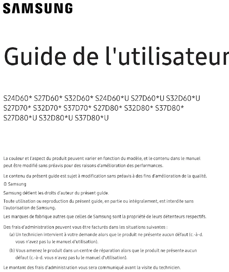 Guide de l'utilisateur La couleur et l’aspect du produit peuvent varier en fonction du modèle, et le contenu dans le manuel peut être modifié sans préavis pour des raisons d’amélioration des performances. Le contenu du présent guide est sujet à modification sans préavis à des fins d'amélioration de la qualité. © Samsung Samsung détient les droits d'auteur du présent guide. Toute utilisation ou reproduction du présent guide, en partie ou intégralement, est interdite sans l'autorisation de Samsung. Les marques de fabrique autres que celles de Samsung sont la propriété de leurs détenteurs respectifs. Des frais d'administration peuvent vous être facturés dans les situations suivantes: (a) Un technicien intervient à votre demande alors que le produit ne présente aucun défaut (c.-à-d. vous n'avez pas lu le manuel d'utilisation). (b) Vous amenez le produit dans un centre de réparation alors que le produit ne présente aucun défaut (c.-à-d. vous n'avez pas lu le manuel d'utilisation). Le montant des frais d'administration vous sera communiqué avant la visite du technicien. S24D60* S27D60* S32D60* S24D60*U S27D60*U S32D60*U S27D70* S32D70* S37D70* S27D80* S32D80* S37D80* S27D80*U S32D80*U S37D80*UTable des matières Avant utilisation du produit Consignes de sécurité 4 Électricité et sécurité 4 Installation 5 Fonctionnement 6 Nettoyage 7 Position correcte lors de l'utilisation du produit 8 Préparatifs Installation 9 Fixation du socle 9 Séparation du col de socle de la base 10 Précautions lors du déplacement du produit 10 Vérification de l'espace autour du produit 11 Ajustement de l'inclinaison et de la hauteur du produit 11 Rotation du produit 13 Verrou antivol 14 Spécifications du kit de montage mural (VESA) 15 Panneau de configuration 16 Guide des touches directes 17