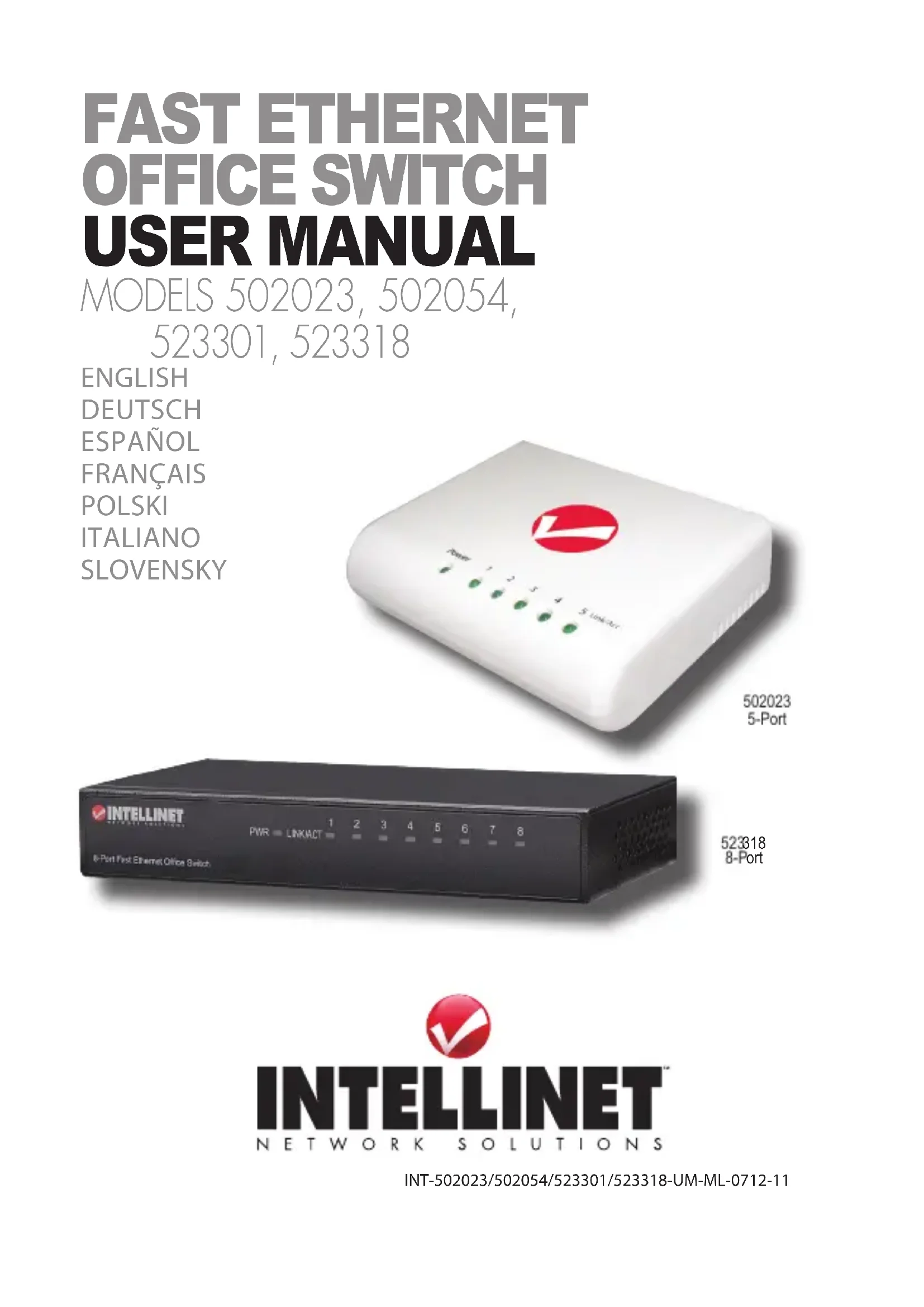 Switch Fast Ethernet de bureau, modèle502023(5ports,boîtierplastique),modèle523301(5ports,boîtiermétallique), modèle502054(8ports,boîtierplastique)oumodèle523318(8ports,boîtiermétallique). DELs Lesvoyantsd’état—Alimentation,Connexion/ Activité—pourdesinformationsetledépannage. CONNEXIONS Alimentation Branchezlaprisefemelledel’adaptateur secteur à la prise jack et la fiche à une prise decourant,puisassurez-vousquequele voyant“PWR”estallumé.NOTE: And’assurerleproprefonctionnement,n’utilisezque l‘adaptateur secteur fourni avec ce produit. TouslesportsdececommutateurprennentenchargelafonctionnalitéAuto-MDI/ MDI-X,doncdescâblescroisésetdesliaisonsmontantesnesontpasnécessairespour desconnectionsauxPC,routeurs,concentratreurs,etc.DescâblesCat5/5eUTP/STP garantissentdesperformancesoptimales;siunDELn’indiquepasd’activité,vériez l’appareil correspondant. INSTALLATION Avantd’utiliserlecommutateur,ilestrecommandédeleplacer: