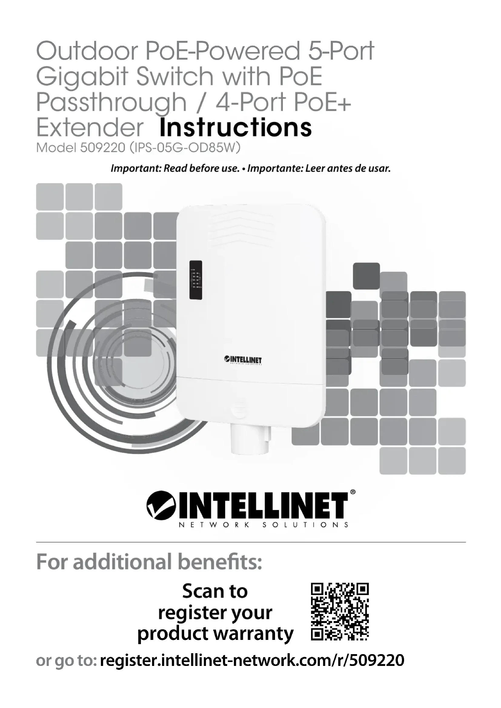 Français Instructions Ce guide décrit les bases pour configurer et opérer cet appareil. Le commutateur Gigabit 5 ports avec PoE Passthrough / 4 ports PoE+ Extension pour l’extérieur est doté d’un port d’entrée PoE 1000 Mbps et de quatre ports de sortie PoE 1000 Mbps. Coque en plastique ABS étanche à la pluie pour l’installation sur poteau. Idéal pour les applications sans fil et de surveillance. Pour obtenir le manuel utilisateur et des spécifications, visitez intellinet-network.com. Enregistrez votre produit sur register.intellinet-network.com/r/509220 ou scannez le code QR figurant sur la couverture. Placement Avant d’utiliser le commutateur, il est recommandé de le placer: