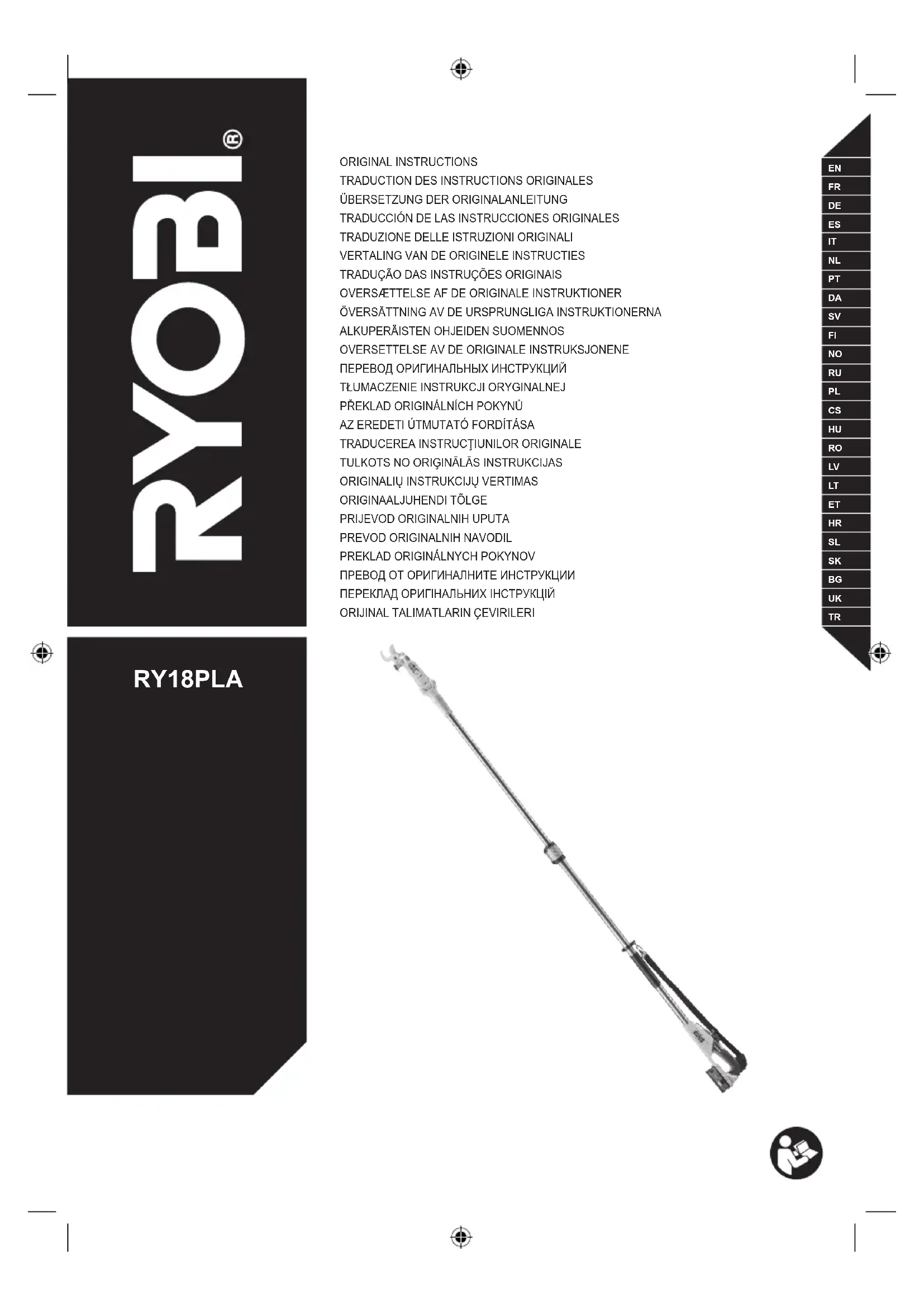 Techtronic Industries GmbH Max-Eyth-Straße 10, 71364 Winnenden, Germany Déclarons par la présente que le produit Ébrancheur télescopique sans fil Marque: RYOBI Numéro de modèle: RY18LPA Étendue des numéros de série: 47533201000001-47533201999999 est conforme aux Directives Européennes et Normes Harmonisées suivantes 2006/42/EC, 2014/30/EU, 2011/65/EU, EN 62841-1:2015, EN ISO 12100:2010,