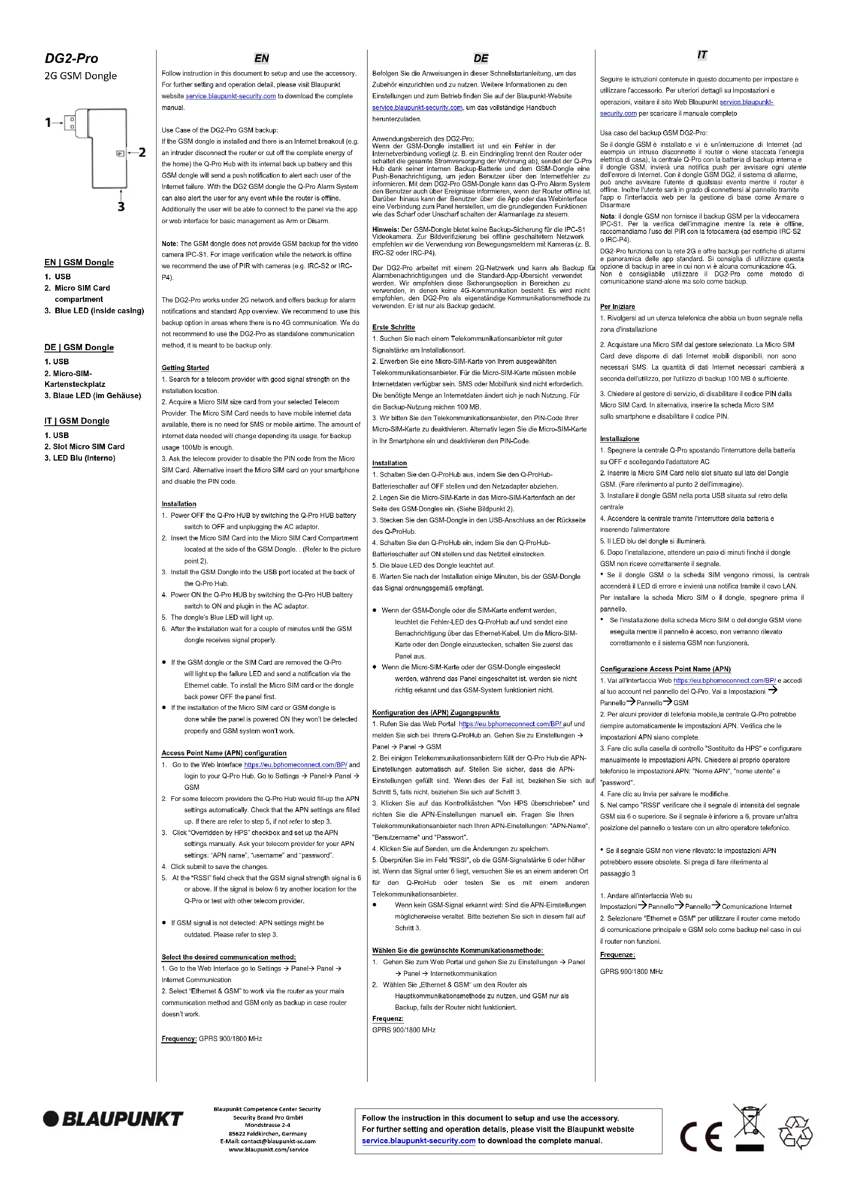 Suivez les instructions de ce document pour configurer et utiliser cet accessoire. Pour plus de détails sur les réglages et le fonctionnement, visitez le site Web de Blaupunkt à l’adresse suivante : service.blaupunkt- security.com pour télécharger le manuel complet. Cas d'utilisation du DG2-Pro: Si le dongle GSM est installé et qu’il survient une panne d’internet (par exemple, un intrus déconnecte le routeur ou coupe l’electricité de toute la maison), le Q-Pro Hub avec sa batterie de secours interne et ce dongle GSM enverra une notification push à chaque utilisateur afin de les alerter de la défaillance Internet. Avec le dongle GSM DG2, le système d'alarme Q-Pro peut également alerter l'utilisateur de tout événement lorsque lerouteur est hors ligne. De plus, l'utilisateur pourra se connecter au panneau via l'application ou l'interface Web pour une gestion de base comme Armer ou Désarmer le système. Remarque: le dongle GSM ne fournit pas de sauvegarde GSM pour la caméra vidéo IPC-S1. Pour la vérification des images lorsque le réseau est hors ligne, nous recommandons l’utilisation de détecteurs infrarouge (PIR) équipés de caméras (par exemple, IRC-S2 ou IRC-P4). Le DG2-Pro fonctionne sur un réseau 2G et offre une prise en charge des notifications d’alarmes ainsi qu’un fonctionnement basique des applications. Nous vous recommandons d'utiliser cette option de sauvegarde dans les zones où il n'y a pas de communication 4G. Nous vous déconseillons d’utiliser le DG2-Pro comme méthode de communication autonome, il s’agit uniquement d’une méthode de communication de sauvegarde. Commencer 1. Recherchez un fournisseur de services de télécommunication dont le signal est de bonne qualité sur le lieu d’installation. 2. Procurez-vous une carte au format Micro SIM auprès du fournisseur télécom sélectionné. La carte Micro SIM doit disposer de l’option données Internet mobile, il n’a pas besoin de l’option SMS ni d’appels. La quantité de données Internet nécessaire changera en fonction de son utilisation, pour une utilisation en tant que méthode de communication de sauvegarde, 100 Mo suffisent. 3. Demandez au fournisseur de télécommunication de désactiver le code PIN de la carte Micro SIM. Vous pouvez également insérer la carte Micro SIM sur votre smartphone et désactiver le code PIN dans les menus de sécurité. Installation 1. Mettez le Q-Pro HUB hors tension en commutant l’interrupteur de batterie du Q-Pro HUB sur OFF et en débranchant l'adaptateur secteur. 2. Insérez la carte Micro SIM dans le compartiment pour carte SIM situésur le côté du dongle GSM. . (Reportez-vous au point 2 de l’image). 3. Installez le dongle GSM dans le port USB situé à l'arrière du hub Q-Pro.4. Mettez le Q-Pro HUB sous tension en commutant l’interrupteur de batterie du Q-Pro HUB sur ON et branchez l'adaptateur secteur. 5. La LED bleue du dongle s’allumera.6. Après l'installation, attendez quelques minutes que le dongle GSM reçoive le signal correctement.