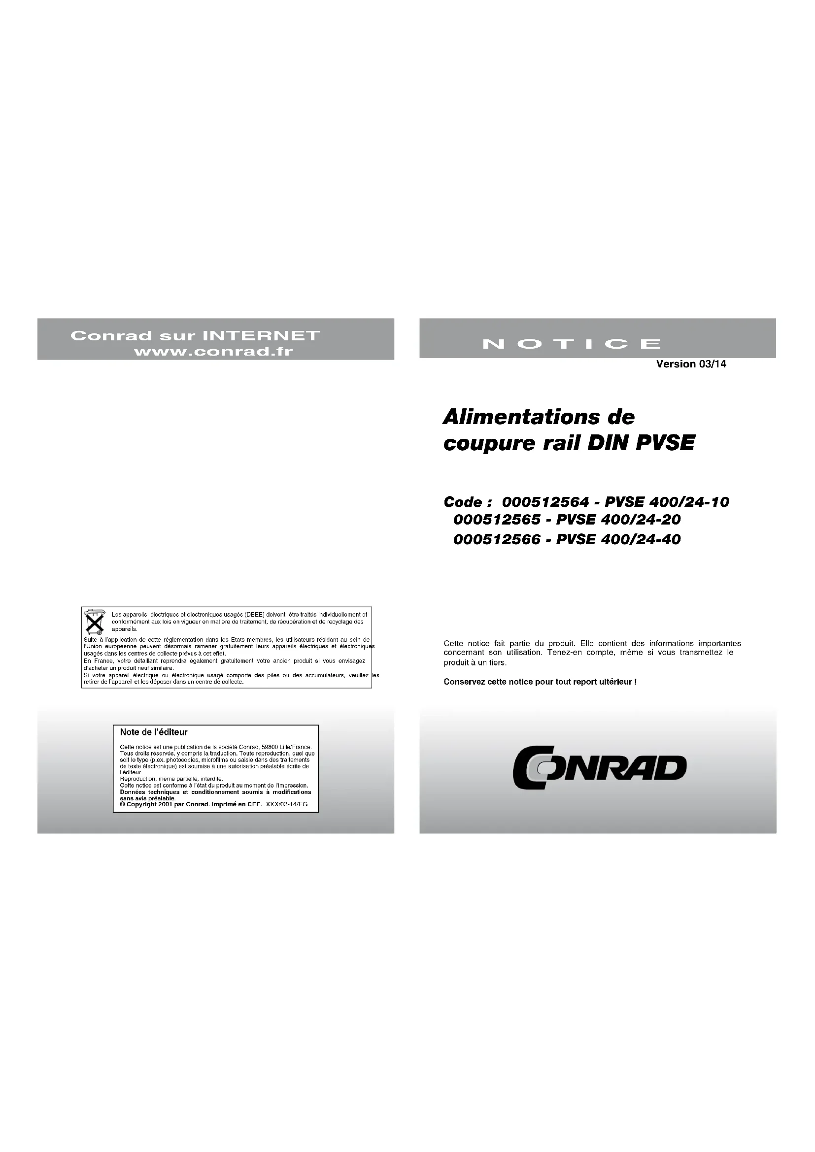 Note de l’éditeur Cette notice est une publication de la société Conrad, 59800 Lille/France.Tous droits réservés, y compris la traduction. Toute reproduction, quel que soit le type (p.ex. photocopies, microfilms ou saisie dans des traitements de texte électronique) est soumise à une autorisation préalable écrite de l’éditeur.Reproduction, même partielle, interdite.Cette notice est conforme à l’état du produit au moment de l’impression.Données techniques et conditionnement soumis à modifications sans avis préalable.© Copyright 2001 par Conrad. Imprimé en CEE. XXX/03-14/EG Alimentations de coupure rail DIN PVSE Code : 000512564 - PVSE 400/24-10