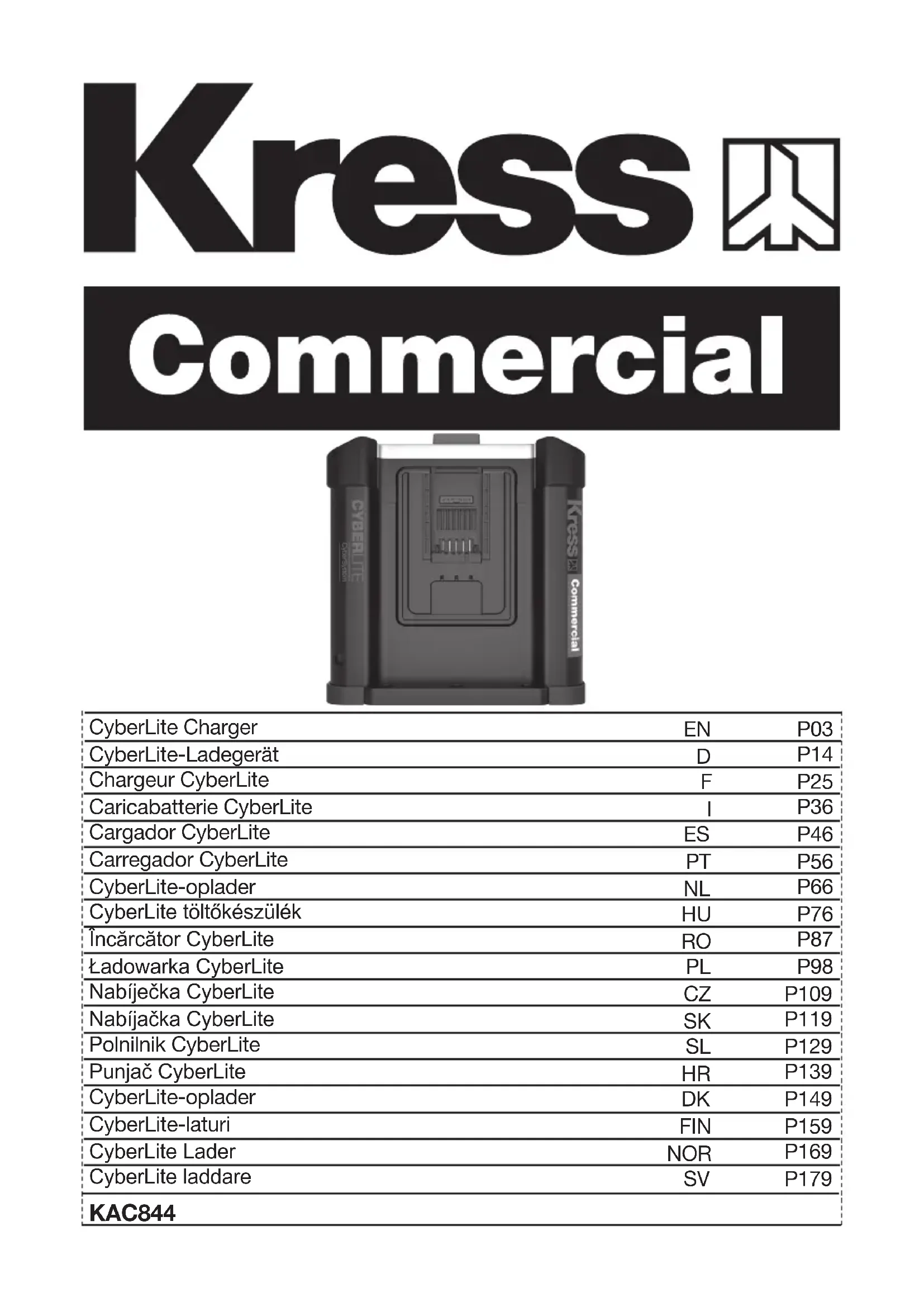 - Déclaration de conformité INTRODUCTION Cher Client, Merci d’avoir acheté ce produit de la marque Kress Commercial. Nous nous engageons à développer des produits de haute qualité pour répondre à vos exigences d'aménagement paysager. La marque Kress est synonyme de service de qualité supérieure. Au cours des années d'utilisation de votre produit, si vous avez des questions ou des inquiétudes à son sujet, veuillez contacter votre revendeur ou notre équipe de service clientèle pour obtenir de l'aide. Nous espérons que vous serez satisfait de votre produit de la marque Kress pour les années à venir. UTILISATION CONFORME Le chargeur CyberLite a été conçu pour faciliter la « Recharge en déplacement », qui permet à l'utilisateur final de recharger les batteries 60V de Kress à partir de la « NOUVELLE » CyberCapsule.26 p. 35