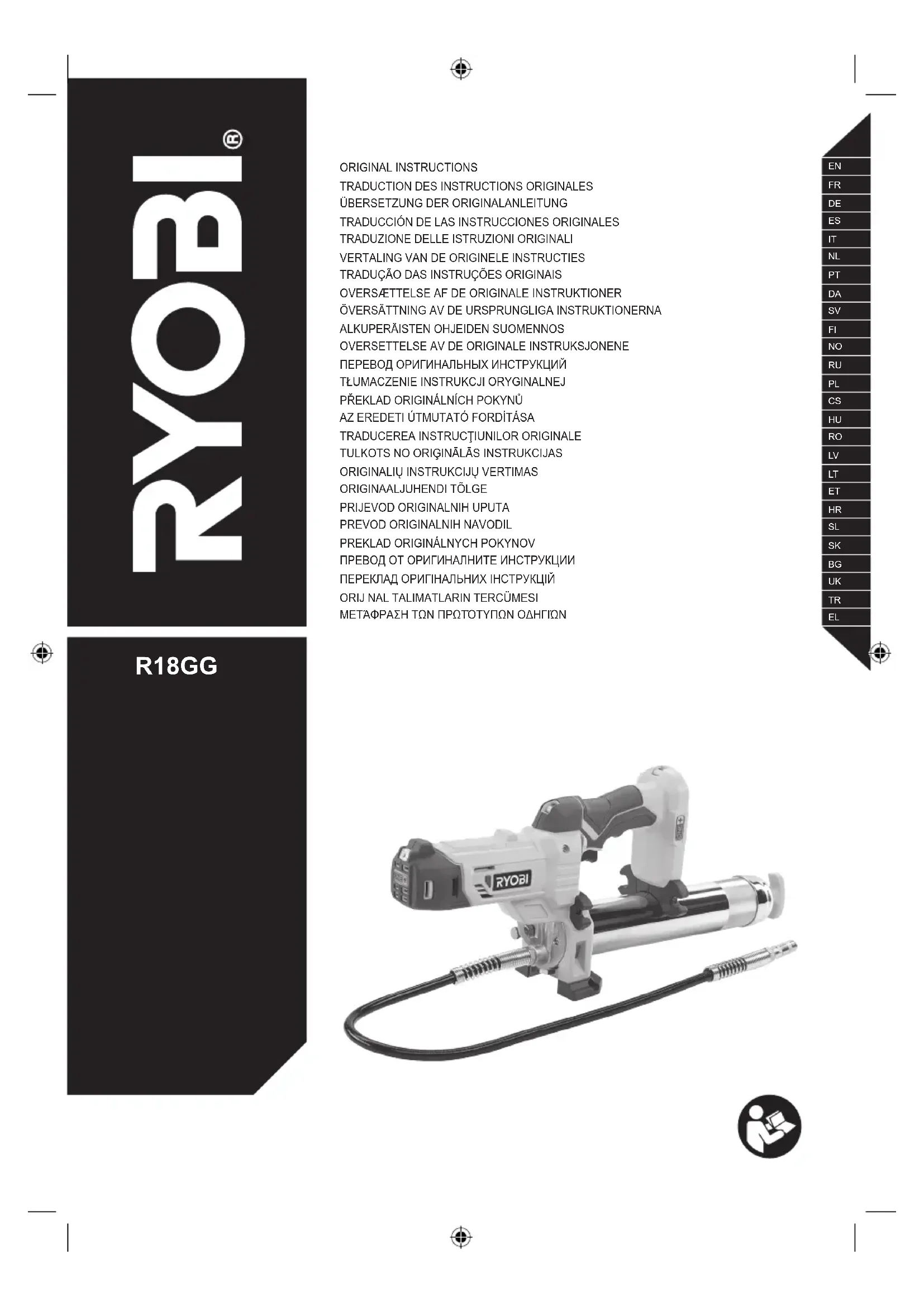 Techtronic Industries GmbHMax-Eyth-Straße 10, 71364 Winnenden, GermanyDéclarons par la présente que le produitPistolet à graisseMarque: RYOBINuméro de modèle: R18GGÉtendue des numéros de série: 47508601000001 - 47508601999999est conforme aux Directives Européennes et Normes Harmonisées suivantes2006/42/EC, 2014/30/EU, 2011/65/EU, EN 55014-1:2017, EN 55014-2:2015, EN 62841-1:2015,La documentation RoHS a été dressée d’après EN IEC 63000:2018