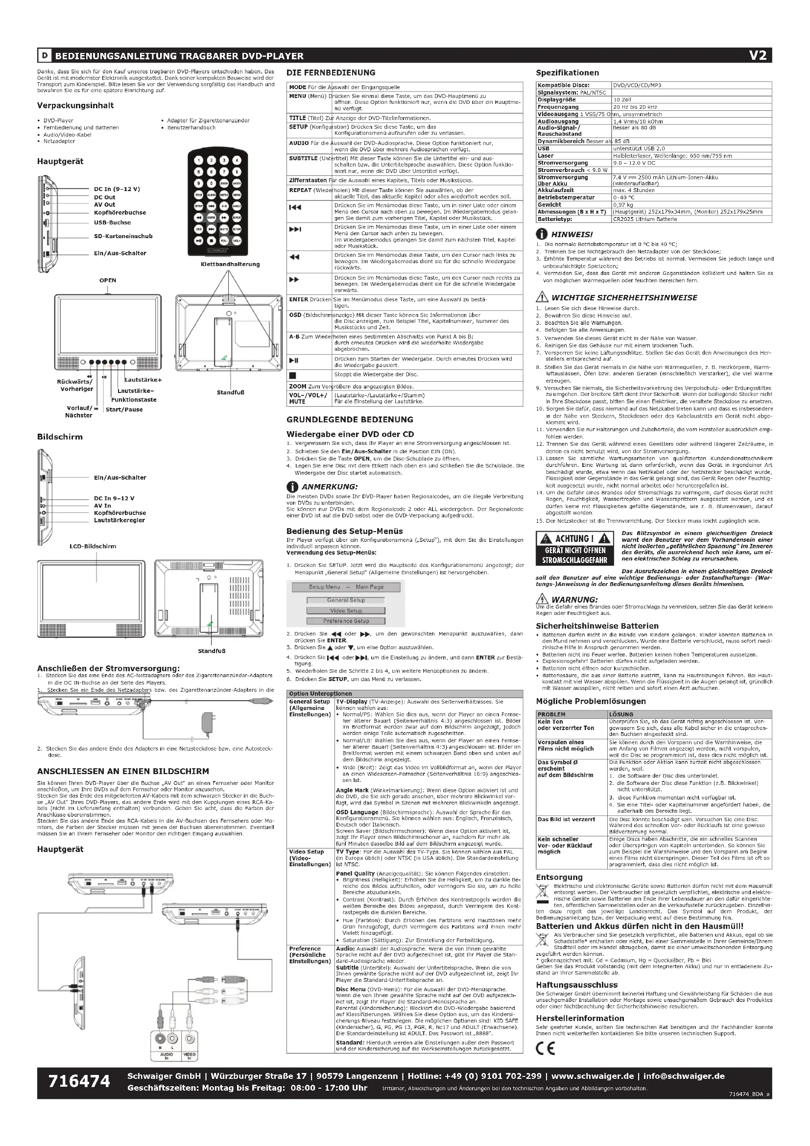 716474 - Lecteur DVD portable Schwaiger - Notice d'utilisation et mode d'emploi gratuit