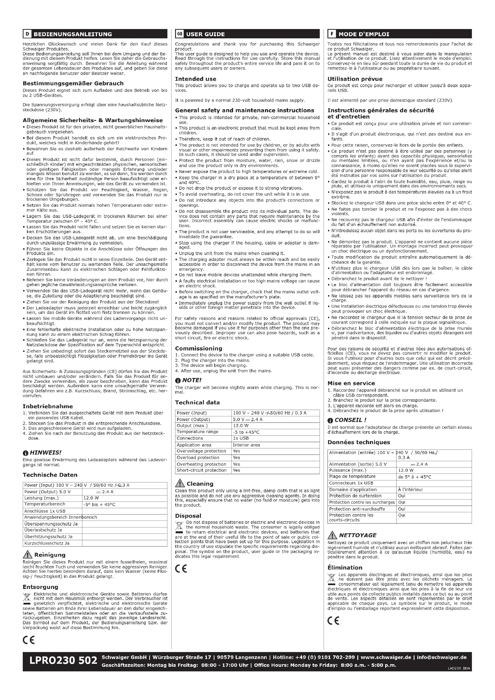 Plage de température de 5° à + 45°C Connecteurs 1x USB Domaine d'application À l'intérieur Protection de surtension Oui Protection contre les surcharges Oui Protection anti-surchauffe Oui Protection contre les courts-circuits Oui NETTOYAGE Nettoyez ce produit uniquement avec un chiffon non pelucheux très légèrement humide et n‘utilisez aucun nettoyant abrasif. Faites par- ticulièrement attention à ce qu‘aucun liquide (humidité, eau) ne pénètre dans le produit. Élimination Les appareils électriques et électroniques, ainsi que les piles ne doivent pas être jetés avec les déchets ménagers. Le consommateur est légalement tenu de remettre les appareils électriques et électroniques ainsi que les piles à la fin de leur vie utile aux points de collecte publics installés dans ce but ou au point de vente. Les aspects détaillés en sont réglementés par le droit applicable de chaque pays. Le symbole sur le produit, le mode d’emploi ou l’emballage reportent expressément cette disposition. Congratulations and thank you for purchasing this Schwaiger product. This user guide is designed to help you use and operate the device. Read through the instructions for use carefully. Store this manual safely throughout the product‘s entire service life and pass it on to any subsequent users or owners. Intended use This product allows you to charge and operate up to two USB de- vices. It is powered by a normal 230-volt household mains supply. General safety and maintenance instructions