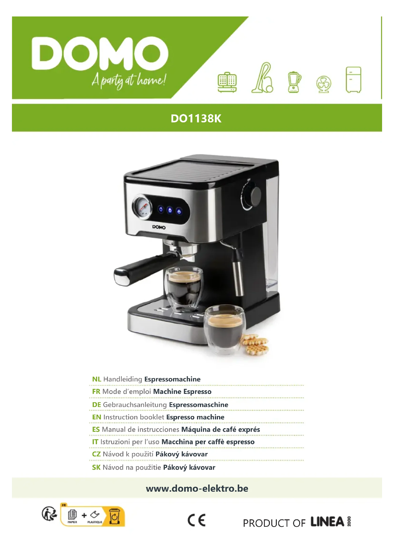 De l’eau s’écoule le long du ltre. • Il y a du café moulu sur le bord du ltre. Éliminez l’excédent de café du bord. Le ltre est coincé dans le porte-ltre. • La boule sur le ltre doit être alignée sur le repère du porte-ltre. Tournez le ltre jusqu’à ce que la petite cavité soit orientée vers le côté de la poignée. DIRECTIVES Ce symbole sur le produit ou son emballage indique que ce produit ne peut être traité comme déchet ménager. Il doit plutôt être remis au point de ramassage concerné, se chargeant du recyclage du matériel électrique et électronique. En vous assurant que ce produit est éliminé correctement, vous favorisez la prévention des conséquences négatives pour l’environnement et la santé humaine qui, sinon, seraient le résultat d’un traitement inapproprié des déchets de ce produit. Pour obtenir plus de détails sur le recyclage de ce produit, veuillez prendre contact avec le bureau municipal de votre région, votre service d’élimination des déchets ménagers ou le magasin où vous avez acheté le produit. L’emballage est recyclable. Traitez l’emballage écologiquement. Cet appareil est conforme à toutes les exigences européennes en matière de sécurité, de santé et de protection de l’environnement. La déclaration UE de cet appareil peut être demandée à tout moment à l’adresse suivante : info@linea2000.bewww.domo-elektro.be 23