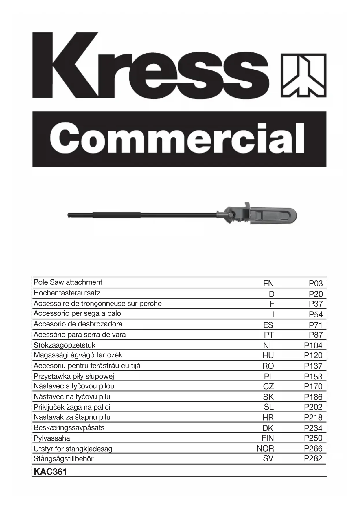 - Déclaration de conformité INTRODUCTION Cher Client, Merci d’avoir acheté ce produit de la marque Kress Commercial. Nous nous engageons à développer des produits de haute qualité pour répondre à vos exigences d'aménagement paysager. La marque Kress est synonyme de service de qualité supérieure. Au cours des années d'utilisation de votre produit, si vous avez des questions ou des inquiétudes à son sujet, veuillez contacter votre revendeur ou notre équipe de service clientèle pour obtenir de l'aide. Nous espérons que vous serez satisfait de votre produit de la marque Kress pour les années à venir. p. 53
