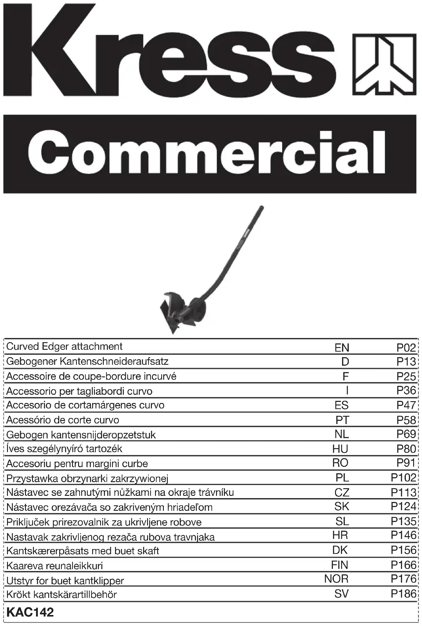 - Déclaration de conformité INTRODUCTION Cher Client, Merci d’avoir acheté ce produit de la marque Kress Commercial. Nous nous engageons à développer des produits de haute qualité pour répondre à vos exigences d'aménagement paysager. La marque Kress est synonyme de service de qualité supérieure. Au cours des années d'utilisation de votre produit, si vous avez des questions ou des inquiétudes à son sujet, veuillez contacter votre revendeur ou notre équipe de service clientèle pour obtenir de l'aide. Nous espérons que vous serez satisfait de votre produit de la marque Kress pour les années à venir. UTILISATION CONFORME En combinaison avec KAC104 - Tête motrice, cette machine est prévue pour tailler l’herbe au bord des trottoirs, des allées de voitures, des bordures et patios.26 p. 35