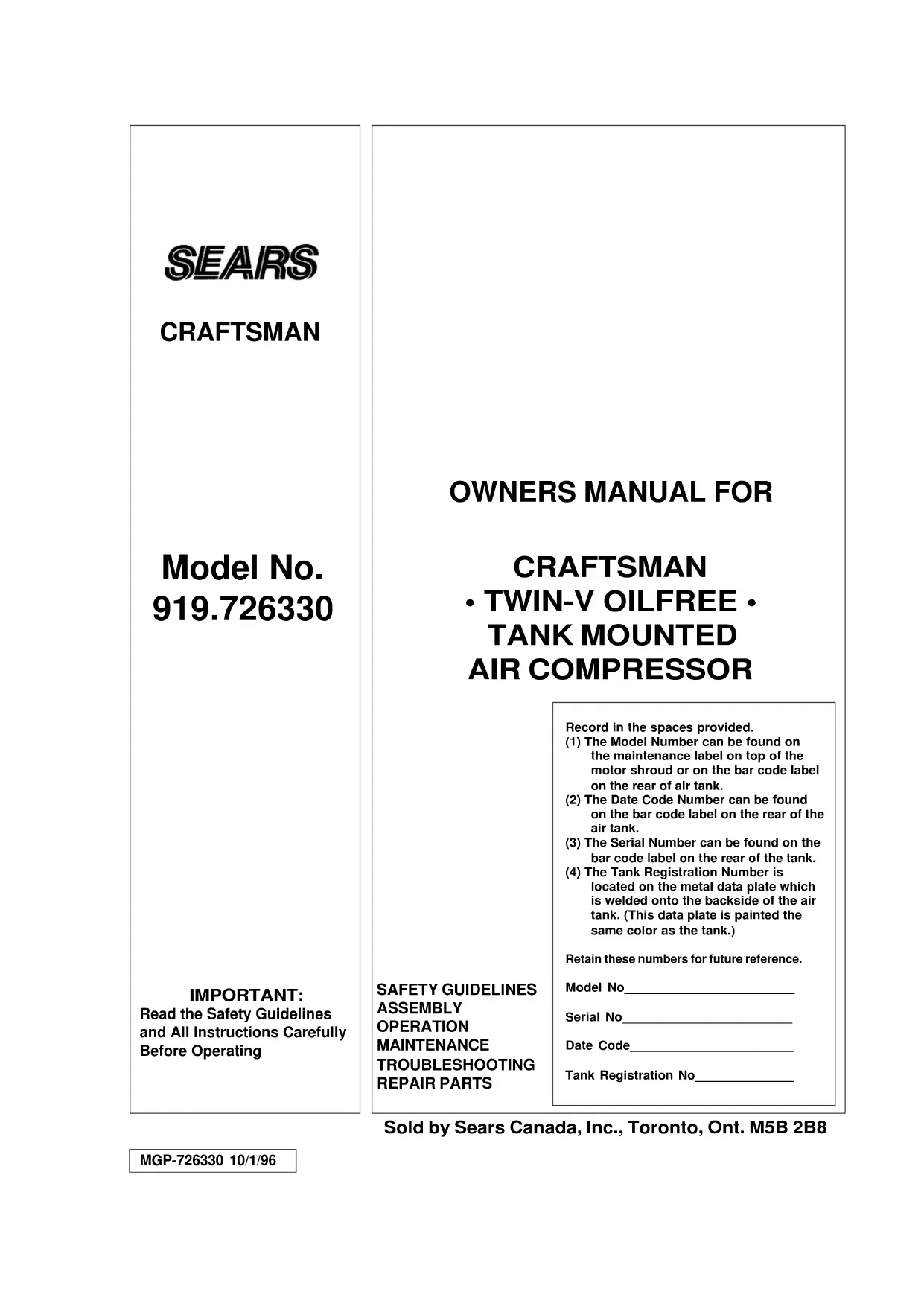 Consignes de sécurité Assemblage Utilisation Entretien Dépannage Pièces Inscrire à l’endroit désigné:1) Le numéro de modèle indiqué surl’étiquette d’entretien apposée sur lemoteur ou sur l’étiquette du codezébré située à l’arrière du réservoir.2) Le numéro de code de date indiquésur l’étiquette apposée à l’arrière duréservoir d'air.3) Le numéro de série indiqué surl’étiquette apposée à l’arrière duréservoir d'air. 4) Le numéro d’enregistrement duréservoir indiqué sur la plaquesignalétique métallique située àl’arrière du réservoir. Cette plaqueest peinte de la même couleur quele réservoir.Noter ces numéros pour référence.Numéro de modèle___________________Numéro de code_____________________Numéro de série_____________________Numéro du réservoir__________________ IMPORTANT: Lire attentivement les directivesde sécurité et le mode d’emploiavant d’utiliser l’appareil.