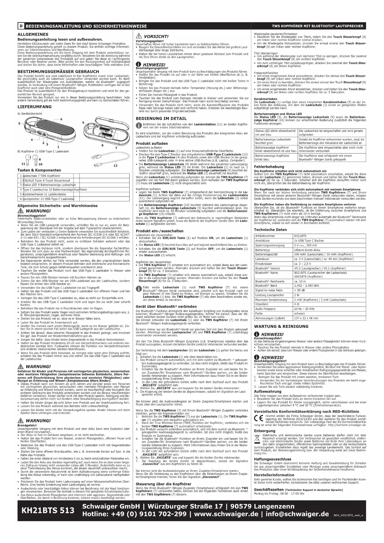 SPEAKER Schwaiger GmbH | Würzburger Straße 17 | 90579 Langenzenn Hotline: +49 (0) 9101 702-299 | www.schwaiger.de | info@schwaiger.de KH21BTS 513 BDA_KH21BTS_web_aGÉNÉRALITÉS Lire le mode d’emploi et le conserver. Toutes nos félicitations et tous nos remerciements pour l’achat de ce produit Schwai-ger. Ce mode d‘emploi appartient à ce produit. Il contient des informations importantes pour la mise en service et l‘utilisation.Ce mode d‘emploi est destiné à vous aider à utiliser le produit. Lisez le attentivement. Conservez-le en lieu sûr pendant toute la durée de vie du produit et remettez-le à l‘utilisateur ou au propriétaire suivant. Vérifiez que le contenu du paquet est complet et assurez-vous qu‘aucun élément ne manque ou est abîmé.