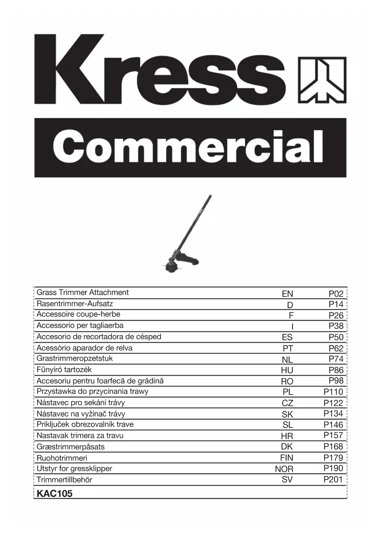 - Déclaration de conformité INTRODUCTION Cher Client, Merci d’avoir acheté ce produit de la marque Kress Commercial. Nous nous engageons à développer des produits de haute qualité pour répondre à vos exigences d'aménagement paysager. La marque Kress est synonyme de service de qualité supérieure. Au cours des années d'utilisation de votre produit, si vous avez des questions ou des inquiétudes à son sujet, veuillez contacter votre revendeur ou notre équipe de service clientèle pour obtenir de l'aide. Nous espérons que vous serez satisfait de votre produit de la marque Kress pour les années à venir. UTILISATION CONFORME En combinaison avec KAC104 - Tête motrice, cette machine est destinée à couper l'herbe et les mauvaises herbes hautes qui ne peuvent être atteintes par une tondeuse à gazon. Cette machine est également utilisée sur les zones dont les pentes ne se prêtent pas à la tonte.F p. 37