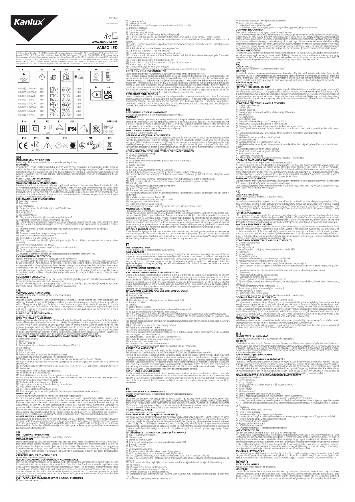 P3: Flux lumineux nominal. P4: Le flux lumineux mentionné se rapporte à la source lumineuse utilisée (module LED). P5: Température de couleurs. P6: Durée de vie nominale. P7: Coefficient du rendu des couleurs. P8: Ce produit contient une source lumineuse d'efficacité énergétique E. P10: Certificat de conformité validant la qualité de la production avec les normes approuvées sur le territoire de l'Union douanière. P11: 2ème classe. Produit où la protection contre la commotion électrique est assurée, outre l'isolement de base, l'isolement double ourenforcé appliqué. P12: Symbole signifie la distance minimale qui peut avoir lieu entre le luminaire (sa source de lumière) et les endroits et les objets qu'il éclaire. P13: Angle d’éclairage. P14: Produit résistant à la poussière. Protection contre les giclées d'eau. P15: On peut utiliser à l'intérieur et à l'extérieur des locaux. P16: Le produit ne fonctionne pas ensemble avec les gradateurs de lumière. P17: Le produit ne peut être utilisé que dans le luminaire équipé du vitre de protection. Il faut immédiatement échanger le globe, l'écran, la vitre de protection cassé ou endommagé. P18: Produit conforme aux Directives de lUnion Européenne (UE). P19: Etendue de la temperature de l'environnement à laquelle peut être exposé le produit. P20: Attention, risque de choc électrique. P21: La source lumineuse LED ne peut pas être remplacée. P22: L'alimentation ne peut être remplacé que par du personnel qualifié (uniquement par le service Kanlux).