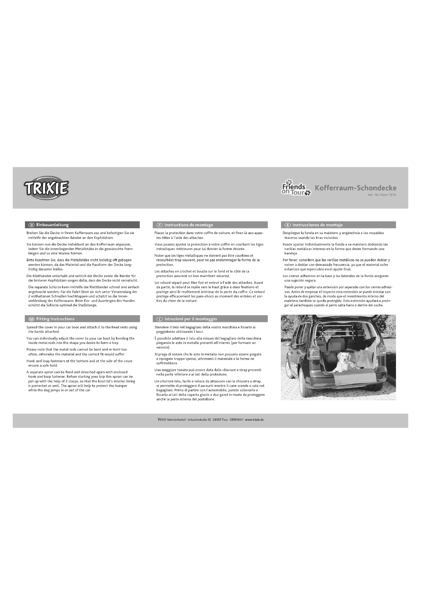 Instructions de montage Placez la protection dans votre coffre de voiture, et fixez-là aux appu-ies-têtes à l’aide des attaches. Vous pouvez ajuster la protection à votre coffre en courbant les tiges métalliques intérieures pour lui donner la forme désirée. Noter que les tiges métalliques ne doivent pas être courbées et recourbées trop souvent, pour ne pas endommager la forme de la protection. Les attaches en crochet et boucle sur le fond et le côté de la protection assurent un bon maintient sécurisé. Un rebord séparé peut être fixé et enlevé à l’aide des attaches. Avant de partir, le rebord se replie vers le haut grâce à deux fixations et protège ainsi le revêtement intérieur de la porte du coffre. Ce rebord protège efficacement les pare-chocs au moment des entrées et sor-ties du chien de la voiture. Kofferraum-Schondecke Art.-Nr./item 1314