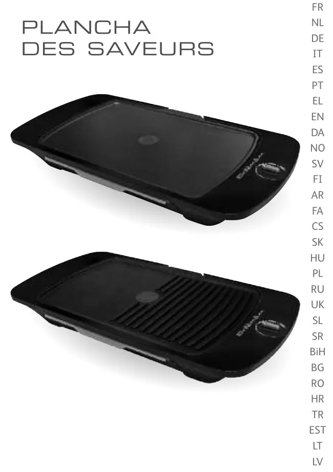 • L’appareil est prohibé à l’extérieur. Cet appareil est destiné uniquement à un usage domestique. Il n’a pas été conçu pour être utilisé dans les cas suivants qui ne sont pas couverts par la garantie : - dans les coins cuisines réservés au personnel des magasins, bureaux et autres environnements professionnels - dans les fermes - par les clients des hôtels, motels et autres environnements à caractère résidentiel - dans les environnements de type chambre d’hôtes 1 • Enlever tous les emballages, autocollants ou accessoires divers à l’intérieur comme à l’extérieur de l’appareil. • Ne jamais placer votre appareil directement sur un support fragile (table en verre, nappe, meuble verni…) ou sur un support de type nappe plastique. • Pour éviter la surchauffe de l’appareil, ne pas le placer dans un coin ou contre un mur. • À la première utilisation, essuyer la plaque à l’aide d’un papier essuie-tout humecté d’huile de cuisson. Enlever le surplus d’huile à l’aide d’un essuie-tout propre. • Veillez à ce que la plaque soit stable et bien positionnée sur la base de l’appareil. N’utilisez qu’une plaque fournie ou acquise auprès du centre de service agréé. 2 • Dérouler entièrement le cordon. • Vérifier que l’installation électrique est compatible avec la puissance et la tension indiquées sous l’appareil. • Ne brancher l’appareil que sur une prise avec terre incorporée. • Si une rallonge électrique doit être utilisée : - elle doit être de section au moins équivalente et avec prise de terre incorporée ; - prendre toutes les précautions nécessaires afin que personne ne s’entrave dedans. • Si le câble d’alimentation est endommagé, il doit être remplacé par le fabricant, son service après-vente ou une personne de qualification similaire afin d’éviter tout danger. • A la première utilisation, un léger dégagement d’odeur et de fumée peut se produire pendant les premières minutes. • Cet appareil n’est pas destiné à être mis en fonctionnement au moyen d’une minuterie extérieure ou par un système de commande à distance séparé. 3 • Ne pas déplacer l’appareil durant son utilisation. • Pour éviter toute dégradation de l’appareil, ne jamais réaliser de recettes flambées sur celui-ci. • Ne jamais interposer de feuille d'aluminium ou tout autre objet entre la plaque et les aliments à cuire. • Ne pas retirer le tiroir de récupération de graisses pendant la cuisson. Si le tiroir de récupération de graisse est plein durant la cuisson, laisser refroidir le produit avant de le vider. • Pour conserver les qualités anti-adhésives du revêtement, ne pas faire de cuisson en papillote. • Ne jamais utiliser l’appareil sans surveillance. • Ne jamais utiliser l’appareil à vide. 4 • Placer le thermostat sur la position mini avant de débrancher. • Cet appareil ne doit pas être immergé. Ne jamais plonger dans l'eau l'appareil ni le cordon. • Bien vérifier que l’appareil est froid et débranché avant de procéder à son rangement. Participons à la protection de l’environnement ! Votre appareil contient de nombreux matériaux valorisables ou recyclables. Confiez celui-ci dans un point de collecte pour que son traitement soit effectué.