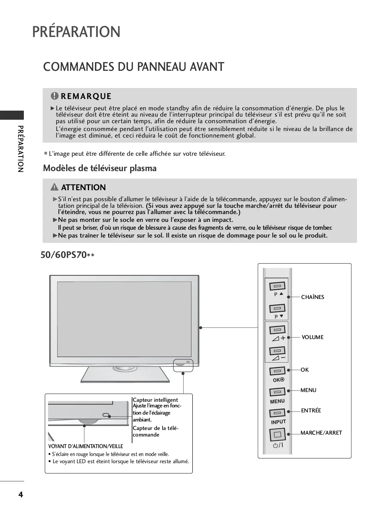 OREMARQUE > Le téléviseur peut être placé en mode standby afin de réduire la consommation d'énergie. De plus le téléviseur doit être éteint au niveau de l'interrupteur principal du téléviseur s’il est prévu qu'il ne soit pas utilisé pour un certain temps, afin de réduire la consommation d'énergie. L'énergie consommée pendant l'utilisation peut être sensiblement réduite si le niveau de la brillance de l'image est diminué, et ceci réduira le coût de fonctionnement global. # L'image peut être différente de celle affichée sur votre téléviseur. Modèles de téléviseur plasma À ATTENTION »S'il n'est pas possible d'allumer le téléviseur à l'aide de la télécommande, appuyez sur le bouton d’alimen- tation principal de la télévision. Gi vous avez appuyé sur la touche marche/arrêt du téléviseur pour l'éteindre, vous ne pourrez pas l'allumer avec la télécommande.) »Ne pas monter sur le socle en verre ou l’exposer à un impact. Il peut se briser, d'où un risque de blessure à cause des fragments de verre, ou le téléviseur risque de tomber. »Ne pas traîner le téléviseur sur le sol. Il existe un risque de dommage pour le sol ou le produit. 50/60PS70++