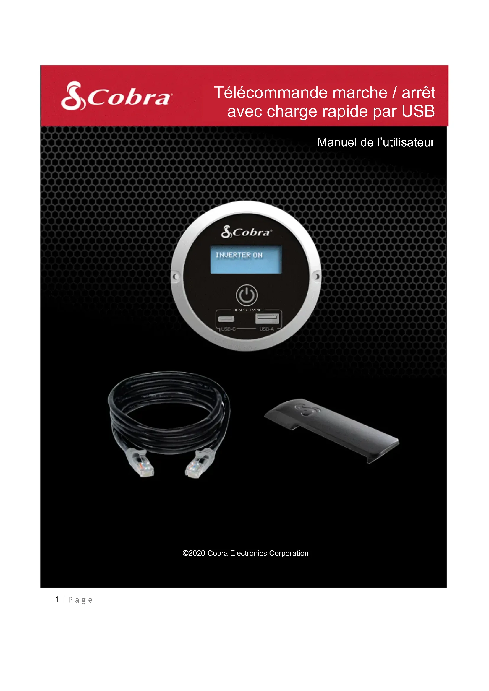 GABARIT DE MONTAGE ......................................................................................................... 123 | Page INTRODUCTION Merci d’avoir acheté la télécommande marche / arrêt Cobra avec charge rapide par USB. Utilisé correcte- ment, ce produit Cobra rendra votre onduleur plus pratique et vous donnera une alimentation fiable pour maintenir vos appareils alimentés et chargés. Veuillez lire ce manuel attentivement avant d’installer et de configurer votre nouvel onduleur.