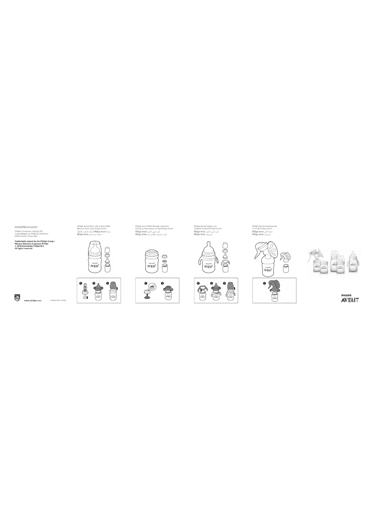 - Le lait maternel peut être conservé dans des biberons ou des récipients Philips Avent stérilisés pendant 48 heures au réfrigérateur (pas dans la porte) ou pendant 3 mois au congélateur. Ne recongelez jamais le lait maternel et n‘ajoutez jamais de lait maternel frais au lait déjà congelé. - Jetez toujours le lait maternel restant après utilisation. - N’utilisez pas de détergents abrasifs ou antibactériens. Ne posez pas les éléments directement sur des surfaces ayant été nettoyées avec des détergents antibactériens. - La stérilisation et les hautes températures peuvent modier les propriétés du plastique. Le capuchon peut être déformé. - Avant chaque utilisation, examinez la tétine d’alimentation et étirez-la dans tous les sens. Jetez un élément dès ses premiers signes d’usure ou d’endommagement. - Ne modiez en aucun cas le produit ou ses pièces. Cela peut entraîner un fonctionnement dangereux du produit. Avant la première utilisation et à chaque utilisation Démontez et nettoyez toutes les pièces. Lavez-les à l’eau chaude savonneuse et rincez-les soigneusement. Stérilisez les pièces à l’eau bouillante pendant 5 minutes ou à l’aide d’un stérilisateur Philips Avent. Cela permet de garantir l’hygiène. Pendant la stérilisation à l’eau bouillante, assurez-vous que la cuve contient susamment d’eau et empêchez le biberon ou les autres pièces de toucher le côté de la cuve. Cela peut provoquer des dommages ou des déformations irrémédiables du produit, pour lesquels Philips ne peut être tenu responsable. Lavez-vous bien les mains et nettoyez les surfaces avec lesquelles les pièces stérilisées seront en contact. Placez soigneusement toutes les pièces du biberon sur une serviette en papier ou un égouttoir propre et laissez-les sécher. La surconcentration de détergents pourrait provoquer des ssures dans les composants en plastique. Dans ce cas, remplacez-les immédiatement. Ce produit est lavable au lave-vaisselle. Les colorants alimentaires peuvent décolorer les pièces. Nettoyez et stérilisez toutes les pièces avant chaque utilisation. Pour des raisons d’hygiène, nous vous recommandons de remplacer la tétine au bout de 3 mois. Assemblage Lorsque vous assemblez le biberon, veillez à placer le capuchon verticalement sur le biberon, an que la tétine reste droite (voir l’illustration). Il est plus facile d’installer la tétine en la tirant par petits à-coups plutôt qu’en la tirant d’un coup. Entretien de la tétine N‘exposez pas la tétine d‘alimentation directement au soleil ou à une source de chaleur et ne la laissez pas dans un produit désinfectant (solution stérilisante) plus longtemps que la durée recommandée car cela pourrait en fragiliser les pièces. Rangez les pièces dans un contenant sec et couvert. Choix de la tétine adaptée à votre bébé Les tétines Philips Avent orent chacune diérents débits an d’aider votre bébé à boire. Au l du temps, vous pouvez changer de tétine pour répondre aux besoins particuliers de votre bébé. Les tétines Philips Avent sont clairement numérotées sur le côté pour indiquer le débit. Assurez-vous d’utiliser une tétine au débit adéquat lorsque vous nourrissez votre bébé. Utilisez un débit inférieur si votre bébé s’étoue, laisse fuir le lait ou a du mal à s’adapter au débit. Utilisez un débit plus élevé si votre bébé s’endort en tétant, s’il s’impatiente ou lorsque la tétée dure très longtemps. Les tétines Philips Avent peuvent être utilisées sur le biberon Philips Avent et les pots de conservation Philips Avent. (1) La tétine 0 mois et plus est idéale pour les nouveau- nés et les bébés allaités de tous âges. Le chire 1 est inscrit sur la tétine. (2) La tétine 1 mois et plus est idéale pour les bébés allaités de tous âges. Le chire 2 est inscrit sur la tétine. (3) La tétine 3 mois et plus est idéale pour les bébés nourris au biberon à partir de 3 mois. Le chire 3 est inscrit sur la tétine. (4) La tétine 6 mois et plus est idéale pour les bébés nourris au biberon à partir de 6 mois. Le chire 4 est inscrit sur la tétine. (I/II/III) Débit variable : tétine en silicone résistant aux mordillements. La tétine la plus robuste, dont le débit est réglable selon les besoins du bébé, est idéale pour les bébés de 3 mois et plus nourris au biberon. La tétine dispose d’une seule fente pour les liquides et les repères I, II, III sont inscrits sur les bords de la tétine. (Y) Tétée épaisse : La tétine conçue pour les aliments les plus épais est idéale pour les bébés de 6 mois et plus nourris au biberon. La tétine dispose d’un seul orice en Y pour les liquides et le symbole Y est inscrit sur la tétine. Remarque : Chaque bébé est unique et les besoins individuels de votre bébé peuvent ne pas correspondre à la description des débits. Commande d’accessoires Pour trouver un revendeur ou acheter un biberon de rechange, une tétine ou tout produit Philips Avent pour bébé, consultez notre site Web au www.philips.com/avent. Compatibilité Veillez à choisir la bonne tétine, correspondant à la bonne bague d’étanchéité de votre biberon : les tétines de la gamme Anti-colic Philips ne conviennent qu’aux bagues d’étanchéité de la gamme Anti-colic Philips, et les tétines Naturel Philips ne conviennent qu’aux bagues d’étanchéité Naturel Philips. English For your child’s safety and health Warning! - Always use this product with adult supervision. - Never use feeding teats as a soother, to prevent choking hazard. - Continuous and prolonged sucking of uids will cause tooth decay. - Always check food temperature before feeding. - It is not recommended to use a microwave to warm up your baby‘s food or drinks. Microwaves might alter the quality of food/drinks and destroy some valuable nutrients and it may produce localized high temperatures. Ther