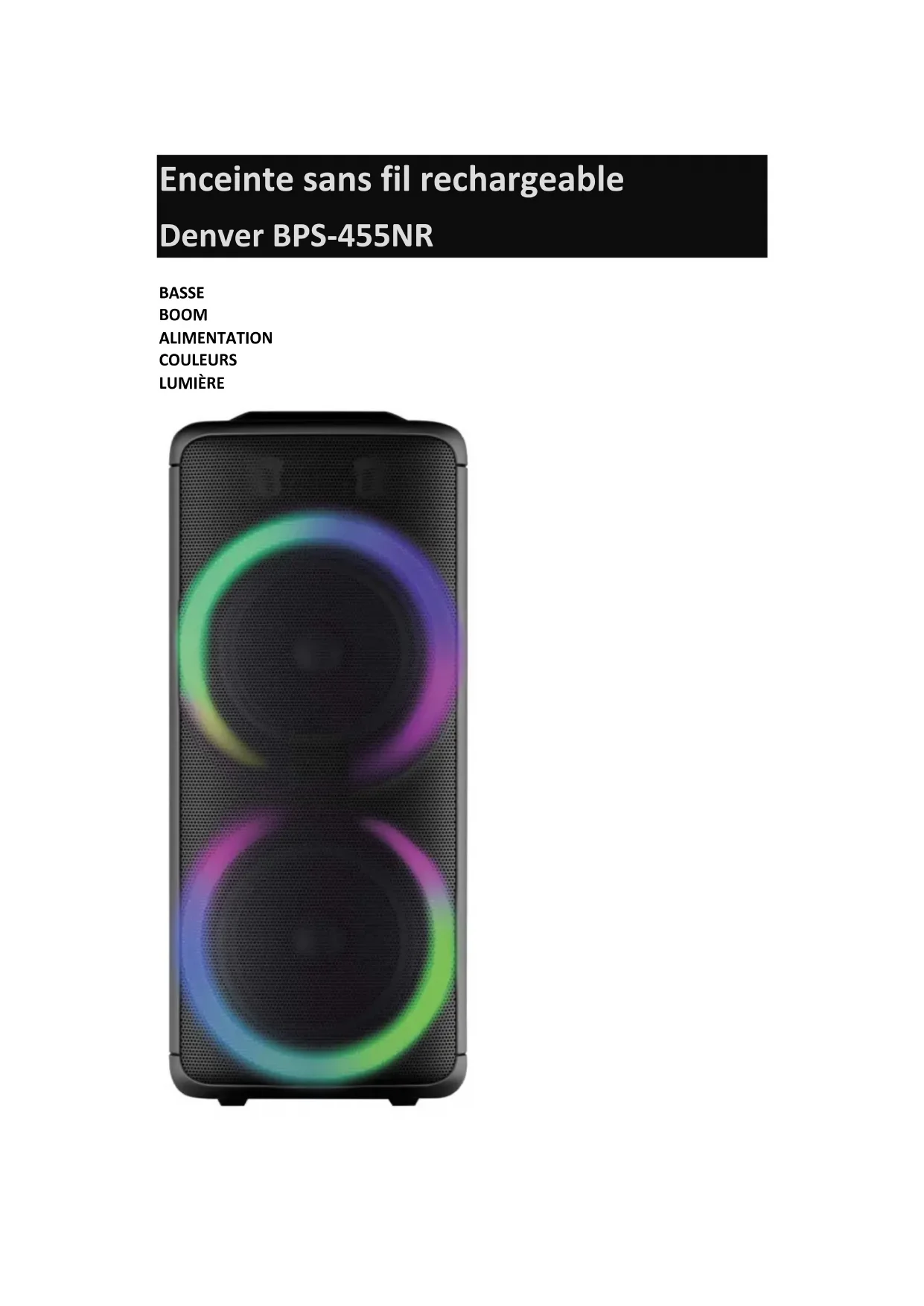Enceinte sans fil rechargeable Denver BPS-455NR BASSE BOOM ALIMENTATION COULEURS LUMIÈRESpécifications : 10" +10" woofer 2" tweeter Alimentation : 72 W RMS Entrée clé USB/carte Micro SD Entrée auxiliaire Connexion Bluetooth, Enregistrement EQ (Pop-Rock-Jazz-Classique-Plat) Fonction TWS : Connexion sans fil, jusqu’à 2 enceintes lisant ensemble pour doubler le son. Batterie rechargeable intégrée de 4 500mA Autonomie de lecture : 1,5 heures à volume 100% Durée de charge : 5-6 heures Entrée MICRO, entrée guitare Priorité du micro Différents modes Lumière disco (contrôlée par le panneau supérieur et la télécommande) GRAVES/Aigus/Contrôle du volume du micro/Écho du micro Dimensions du produit : 33 x 28 x 84 cm Poids du produit : 11,15 kg Contenu de l’emballage : - Guide d’utilisation - Télécommande - Cordon d’alimentationUtilisation du panneau supérieur