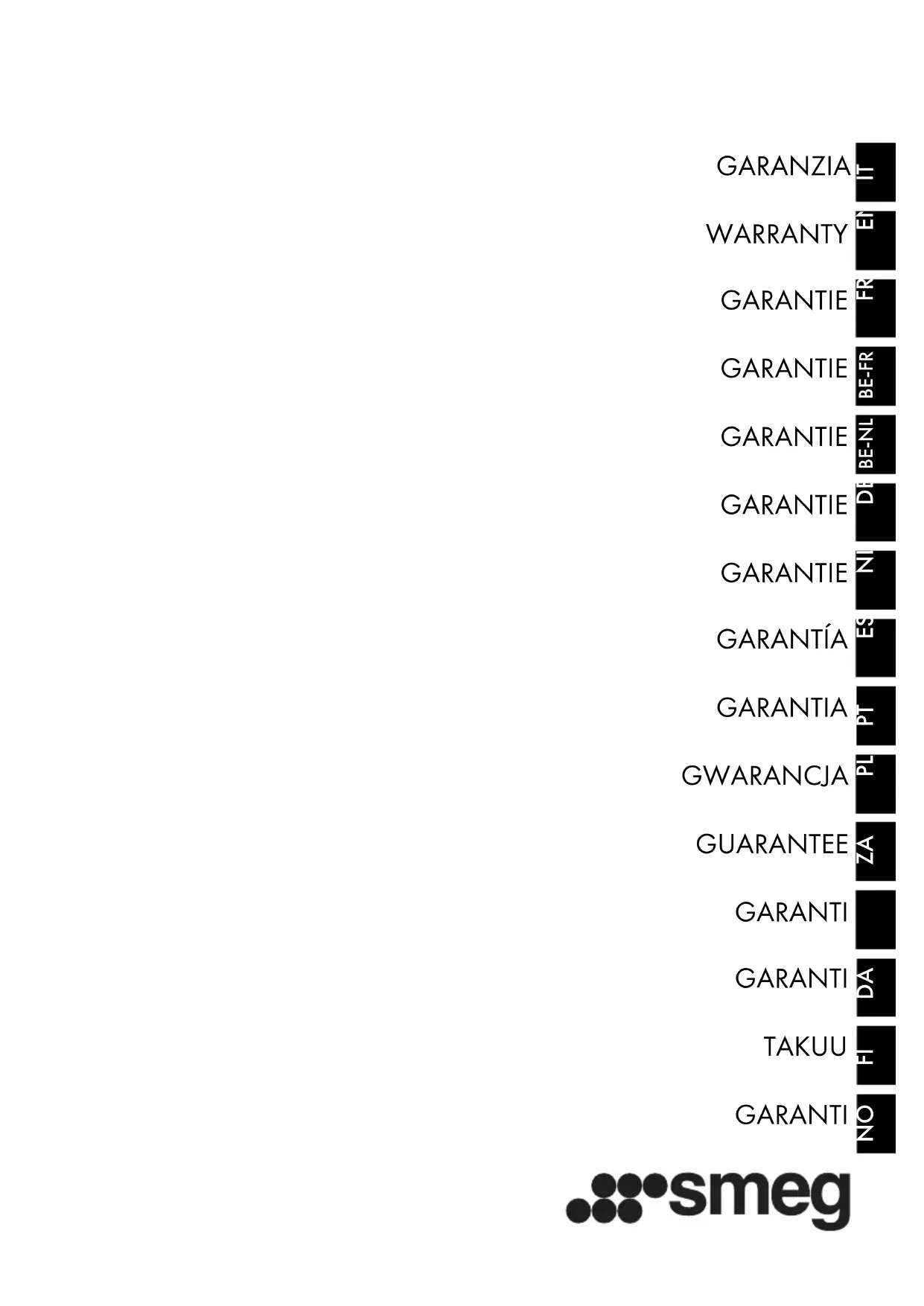 découper en suivant les pointillésdécouper en suivant les pointilléssuivre au verso FRFR DECLARATION DE CONDITIONS DE GARANTIE POURLES APPAREILS SMEG INSTALLES EN FRANCEVotre appareil vous est livré avec une garantie de 2 ans les conditions de garantie sont précisées ci-dessous.Pour vous faire bénéficier d’un meilleur service dans le cadre de cette garantie, la Carte d’Enregistrement ci-jointe doit être retournée au service Garantie SMEG France. SMEG / 83 rue Marcel Mérieux 1944 69960 CORBAS.DOMMAGES GARANTIS: Sont couverts par la garantie ( sous les réserves formulées ci-après ), les frais ( pièces, main d’oeuvre et déplacement ) ayant pour origine un phénomène électrique, électronique, électromécanique ou mécanique interne à l’appareil.La garantie ne joue pas pour les vices apparents : obligation est faite au client d’inspecter la marchandise à la livraison. A défaut, celle-ci est réputée exempte de vice.SONT EXCLUS DE LA GARANTIE- les appareils utilisés à des fins professionnelles, commerciales ou non domestiques. - les dommages dus à une mauvaise utilisation ou à une erreur de manipulation (exemple: four ne marchant pas car il a été programmé pour se mettre en marche en automatique à une heure prédéterminée), au manque d’entretien. - les frais de déplacement et main d’œuvre relatifs à des nettoyages, réglages, vérifications ou panne non constatée. Smeg France Service Garantie 83, rue Marcel Mérieux 69960 CORBAS (Lyon) Tel: 04.72.21.51.61 Fax: 04.72.50.00.14 email: sav@smeg.fr Apposez ici l'étiquette "produit" adhésive, reçue, dans le cas où elle est présente au dos de ce coupon, sinon, remplir les espaces ci-dessous en faisant référence à la plaque caractéristique du produit. MOD:_______________________ S/N:________________________ ATTENTION! COUPER ET RENVOYER EN ENVELOPPE CACHETEE Á L’ADRESSE INDIQUEE CI-DESSUS.Garantie