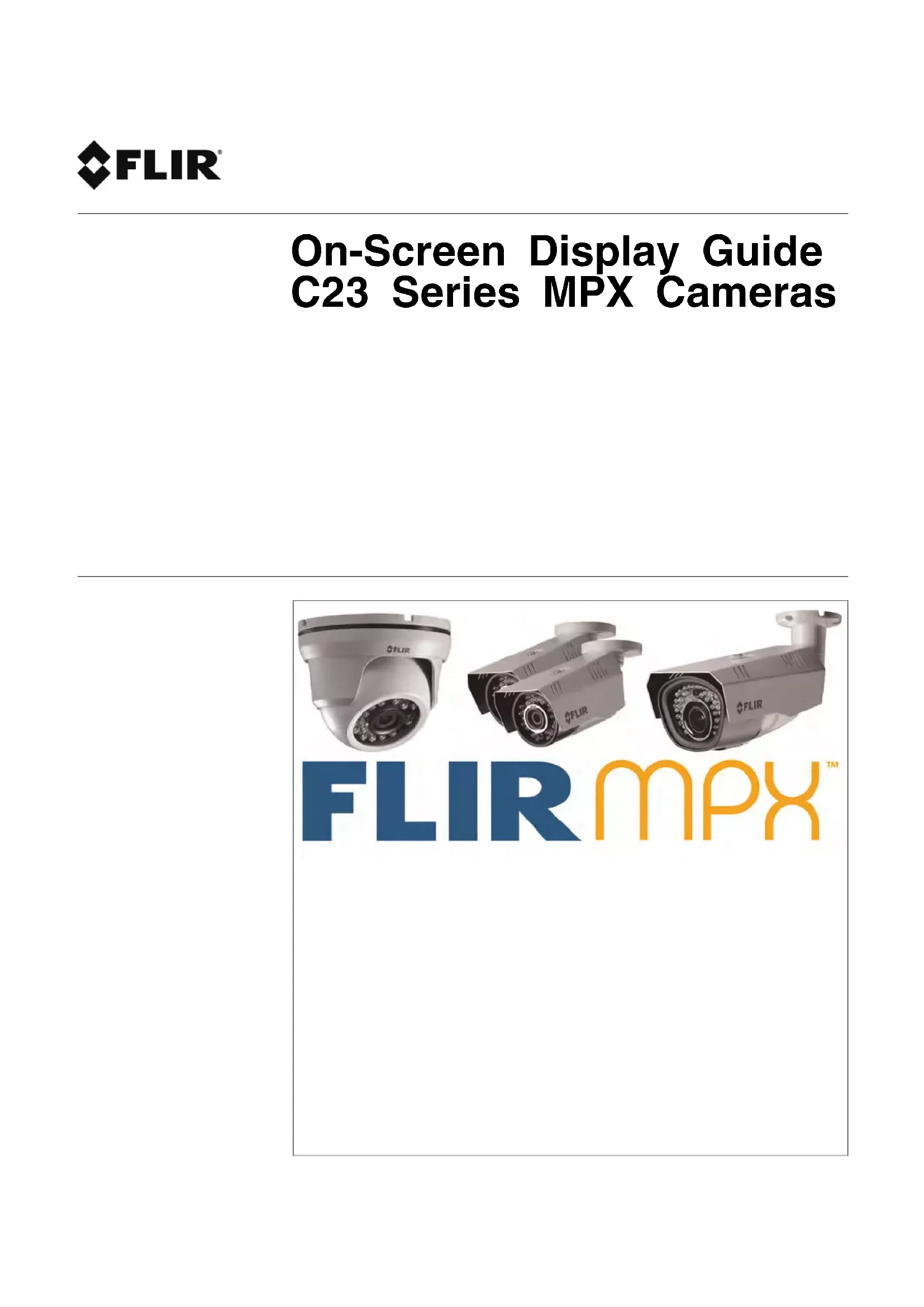 Head: 22521 Language: fr-CA Modified: 2015-01-13 Formatted: 2015-01-13 Site Web www.flirsecurity.com/pro Assistance technique 1-866-816-5919 Service à la clientèle 1-866-344-4674 Droits dauteur © 2015, FLIR Systems, Inc. Tous droits réservés dans le monde entier. Les noms et les marques figurant sur ce site Web sont des marques déposées ou des marques commerciales de FLIR Systems et/ou de ses filiales. Toutes les autres marques, et tous les autres noms commerciaux ou noms de société mentionnés dans ce site Web sont utilisé(e)s pour les seules fins didentification et sont la propriété de leurs propriétaires respectifs. Mentions légales Les spécifications sont sujettes à changement sans préavis. Les modèles d’appareils photo et d’accessoires sont sujets aux considérations des marchés régionaux. Des procédures d’octroi de licence peuvent être applicables. Les produits décrits sur ce site Web peuvent être assujettis au Règlement sur lexportation des États- Unis. En cas de questions, veuillez communiquer avec exportquestions@flir.com.Guía de visualización en pantalla Cámaras MPX Serie C23Guía de visualización en pantalla Cámaras MPX Serie C23 #LX400044; r. 2.0/22520/22521; es-MX iiiGracias por comprar este producto. FLIR se compromete a brindar a nuestros clientes una solución de seguridad confiable de alta calidad. Este manual se refiere a los siguientes modelos: Serie C23 Para obtener el último manual en línea, descargas o actualizaciones de productos o si desea conocer nuestra línea completa de productos accesorios, ingrese a nuestro sitio web: www.flirsecurity.com/pro ADVERTENCIA