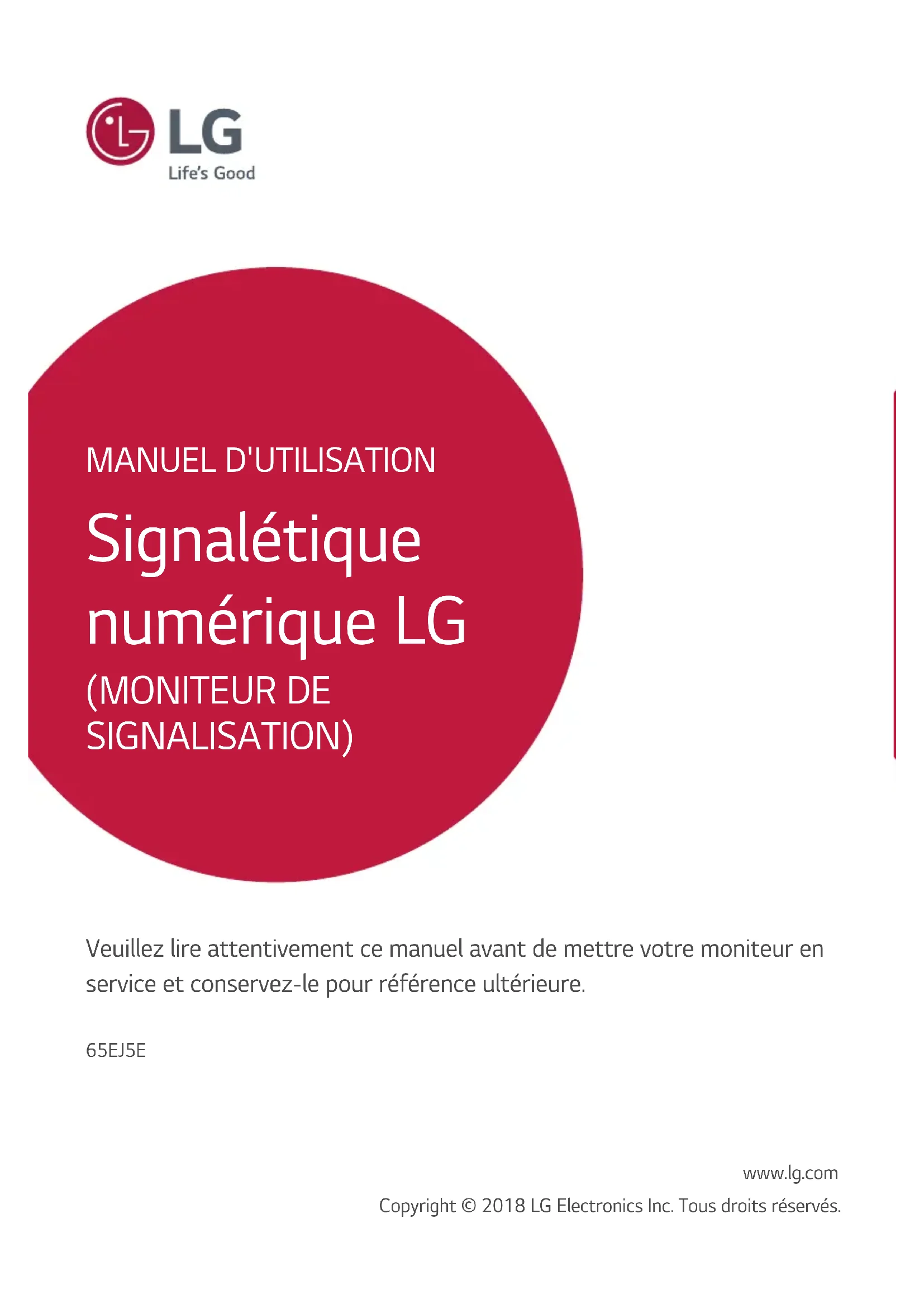 www.lg.com Copyright © 2018 LG Electronics Inc. Tous droits réservés. Veuillez lire attentivement ce manuel avant de mettre votre moniteur en service et conservez-le pour référence ultérieure. 65EJ5E MANUEL D'UTILISATION Signalétique numérique LG (MONITEUR DE
