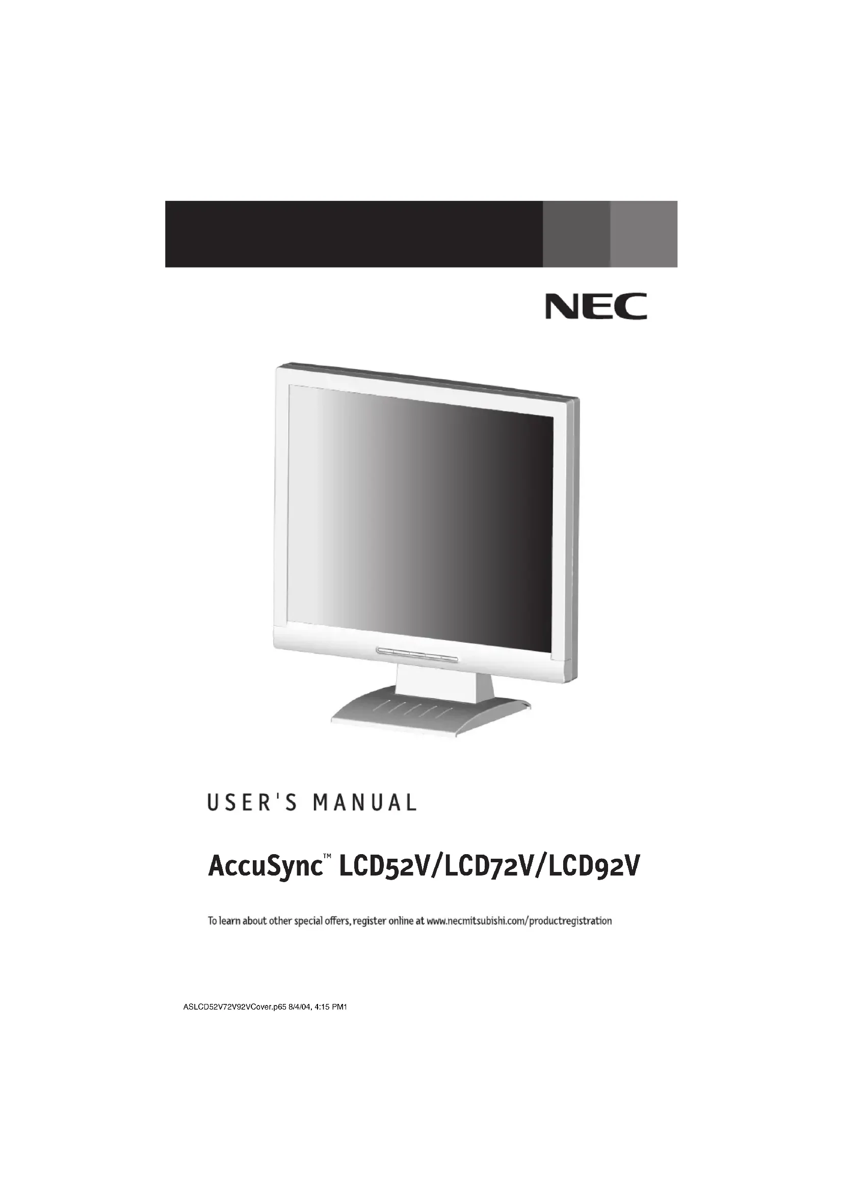 , NEC-Mitsubishi Electronics Display of America a veillé à ce que ce produit respecte les normes ENERGY STAR en matière de rendement énergétique. Le logo ENERGY STAR ne représente aucun aval par l’EPA de quelque produit ou service que ce soit. Série LCD NEC No de pièce HD67NM55000Imprimé au TaiwanAS52V72V92VManual080404.p65 8/5/04, 7:47 PM43Part No. HD67NM55000Printed in Taiwan