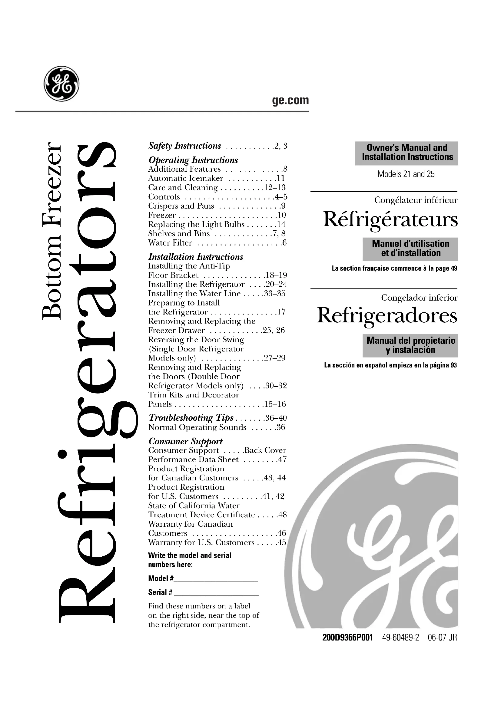 IMPORTANT — Respectez toutes les ordonnances et les codes locaux.• Note à l’installateur – Assurez-vous de laisserces instructions au consommateur.• Note au consommateur – Conservez cesinstructions pour référence future.• Niveau de compétence – L’installation de cet appareil nécessite des compétencesmécaniques de base.• Temps d’installation – Installation duréfrigérateur20 minutesInstallation de laconduite d’eau 30 minutesInstallation du supportdu mécanisme anti-basculement 20 minutes• L’installateur est responsable de bien installerce réfrigérateur.• Toute panne du produit due à une mauvaiseinstallation n’est pas couverte par la garantie.Questions? Appelez le 1.800.561.3344 ou Visitez notre site Web à l’adresse : www.electromenagersge.ca Instructions Réfrigérateur d’installation Modèles 21 et 25