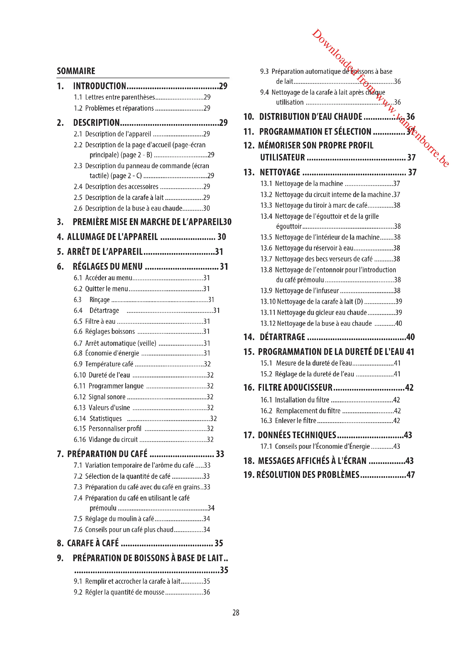 Le lait ne sort pas du tube de distribution (E3) Le couvercle (E1) de la carafe à lait est sale Nettoyer le couvercle de la carafe à lait de la façon décrite dans le par. «13.10 Nettoyage de la carafe à lait (D)». S'assurer que le tube de prise du lait (E5) soit bien inséré dans le logement prévu sur le fond du couvercle de la carafe à lait (g. 17) Enler le tube de prise du lait jusqu’au fond Le lait contient des grosses bulles, sort par jets du tube de distribution du lait (E3) ou est peu mousseux Le lait n'est pas susamment froid ou n'est pas demi-écrémé ou écrémé Utiliser de préférence du lait écrémé ou de- mi-écrémé, à la température du réfrigérateur (environ 5ºC). Si le résultat n'est pas encore le résultat souhaité, essayer de changer de marque de lait. Le bouton de réglage de la mousse (E2) est mal réglé. Régler en suivant les instructions du par. «9.2 Régler la quantité de mousse». Le couvercle (E1) ou le bouton de réglage de la mousse (E2) de la carafe à lait ou le connecteur du tube de prise du lait (E7) sont sales Nettoyer le couvercle, le bouton de la carafe à lait et le connecteur du tube de prise du lait comme décrit au par. «13.10 Nettoyage de la carafe à lait (D)». Le gicleur eau chaude (A15) est sale Nettoyer le gicleur de la façon décrite dans le par. «13.11 Nettoyage du gicleur eau chaude». La machine n’est pas utilisée et émet des bruits ou de petits nuages de vapeur La machine est prête à l’emploi ou a été éteinte depuis peu et quelques gouttes de condensa- tion tombent à l’intérieur du vaporisateur en- core chaud Ce phénomène fait partie du fonctionnement normal de l’appareil ; pour limiter le phéno- mène, vider l’égouttoir. Downloaded from www.vandenborre.be