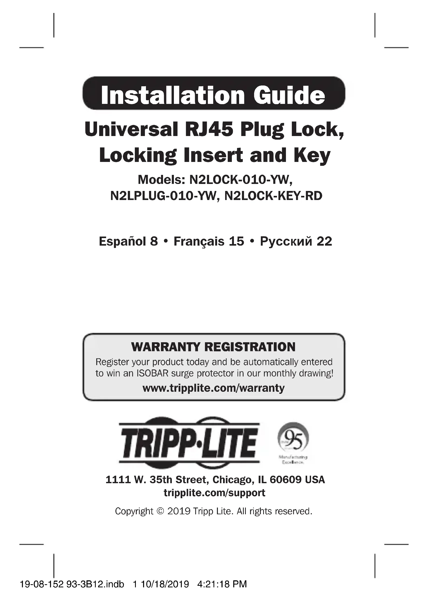 Libere la llave. 19-08-152 93-3B12.indb 14 10/18/2019 4:21:19 PM15 1111 W. 35th Street, Chicago, IL 60609 USA tripplite.com/support Guide d'installation Dispositif de verrouillage universel de prise RJ45, pièce d'insertion de verrouillage et clé Modèles : N2LOCK-010-YW,