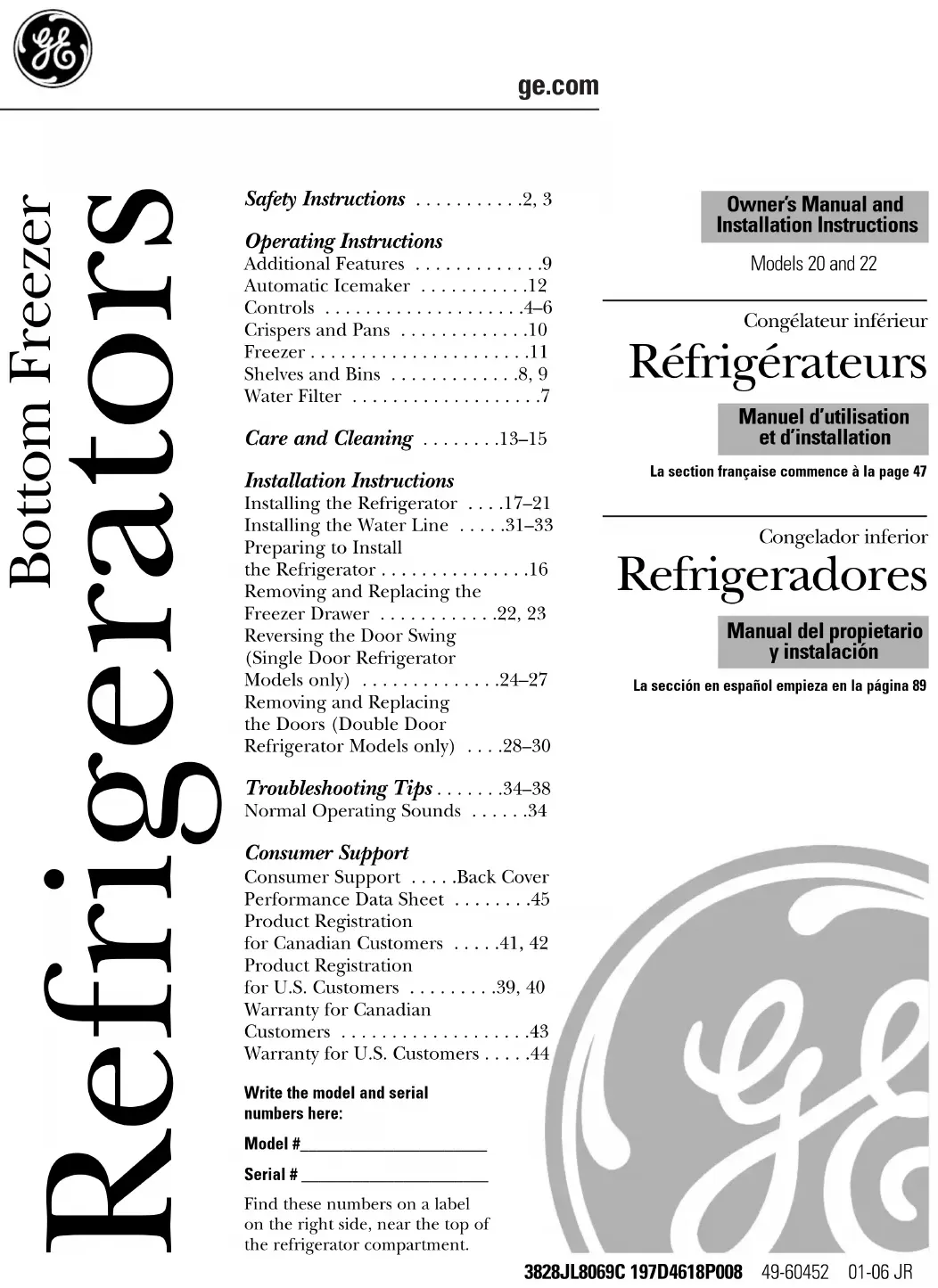 IMPORTANT — Respectez toutes les ordonnances et les codes locaux.• Note à l’installateur – Assurez-vous de laisserces instructions au consommateur.• Note au consommateur – Conservez cesinstructions pour référence future.• Niveau de compétence – L’installation de cet appareil nécessite des compétencesmécaniques de base.• Temps d’installation – Installation duréfrigérateur20 minutesInstallation de laconduite d’eau 30 minutes• L’installateur est responsable de bien installerce réfrigérateur.• Toute panne du produit due à une mauvaiseinstallation n’est pas couverte par la garantie.Questions? Appelez le 1.800.361.3400 ou Visitez notre site Web à l’adresse : www.electromenagersge.ca Instructions Réfrigérateur d’installation Modèles 20 et 22