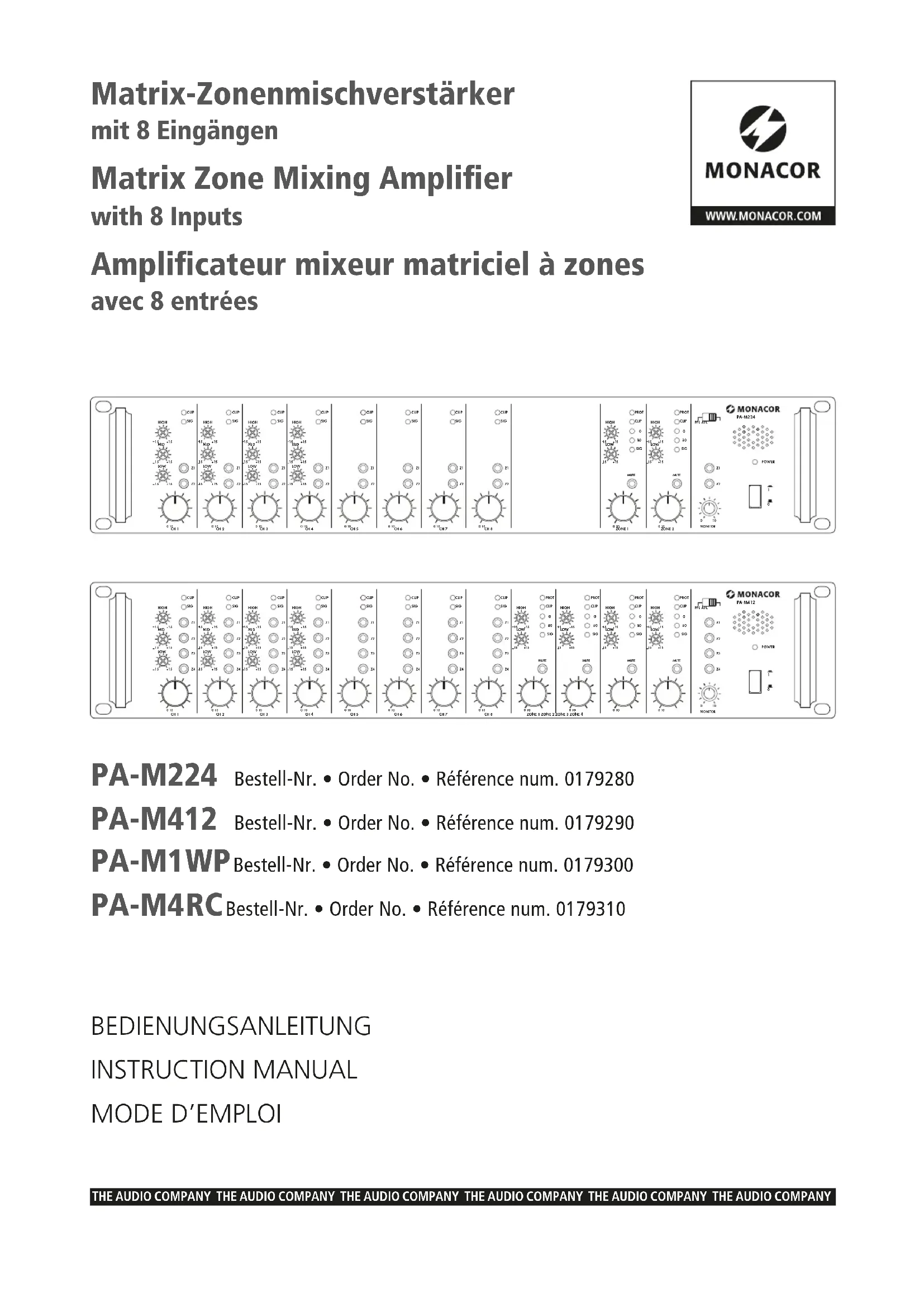 Si l’étage final de l’amplificateur d’une zone est en surchauffe ou en surcharge, le circuit de protection interrompt la voie de signal vers la connexion haut-parleur SPEAKER (20) dans cette zone. Dans ce cas, aucun signal n’est audible dans la zone, la LED PROT (6) corres- pondante brille. Avec le réglage ZONE (8) correspondant, diminuez le volume de la zone. Si une fois l’étage final refroidi, la LED PROT ne s’éteint toujours pas, le problème doit être identifié puis résolu par un technicien.18 Français 8 Caractéristiques techniques Amplificateur PA-M224 PA-M412 Nombre de canaux d’entrée 8 8 Nombre de zones 2 4 Puissance de sortie nominale 2 × 240 W 4 × 120 W Taux de distorsion < 1 % < 1 % Sorties zones Branchement 2 × haut-parleur 100 V 2 × signal ligne Bornes à vis 4 × haut-parleur 100 V 4 × signal ligne Bornes à vis Alimentation fantôme pour Mic CH 1 – 4 24 V 24 V Entrées Mic CH 1 – 4 Line CH 1 – 4 Line CH 5 – 8 Sensibilité entrée / impédance ; branchement 2,5 – 380 mV*/ 20 kΩ; XLR, symétrique 30 – 2000 mV*/ 20 kΩ; jack 6,35, symétrique 30 – 2000 mV*/ 20 kΩ; RCA et jack 6,35, asym. *Gain max. – Gain min. Bande passante 20 – 20 000 Hz Egaliseur pour les entrées CH 1 – 4 Graves Médiums Aigus ±12 dB / 80 Hz ±12 dB / 2,5 kHz ±12 dB / 12,5 kHz Egaliseur pour les zones Graves Aigus ±15 dB / 80 Hz ±15 dB / 12 kHz Rapport signal / bruit > 70 dB Type étage final Classe D Température fonctionnement 0 – 40 °C Alimentation 230 V/ 50 Hz 230 V/ 50 Hz Consommation 800 VA max. 860 VA max. Dimensions (l × h × p) 482 × 88 × 320 mm, 2 U 482 × 88 × 320 mm, 2 U Poids 5,7 kg 6,2 kg Microphone de commande PA-M4RC Type Microphone électret Bande passante 45 – 15 000 Hz Sensibilité 1 mV/ Pa Alimentation via PA-M224, PA-M412 Température fonctionnement 0 – 40 °C Dimensions de la base (l × h × p) Longueur col de cygne 140 × 65 × 205 mm 420 mm Poids 860 g Branchement Prise RJ 45 Module mural PA-M1WP Entrées 1 × Mic 1 × Line Sensibilité entrée/impédance ; branchement 3 mV/ 20 kΩ; XLR, symétrique 420 mV/30 kΩ; RCA, asymétrique Alimentation fantôme pour Mic 14 V, non déconnectable Alimentation via PA-M224, PA-M412 Température fonctionnement 0 – 40 °C Dimensions (l × h × p) 80 × 80 × 50 mm Poids 90 g Branchement Prise RJ 45 Tout droit de modification réservé. Notice d’utilisation protégée par le copyright de MONACOR INTERNATIONAL GmbH & Co. KG. Toute reproduction même partielle à des fins commerciales est interdite.Copyright