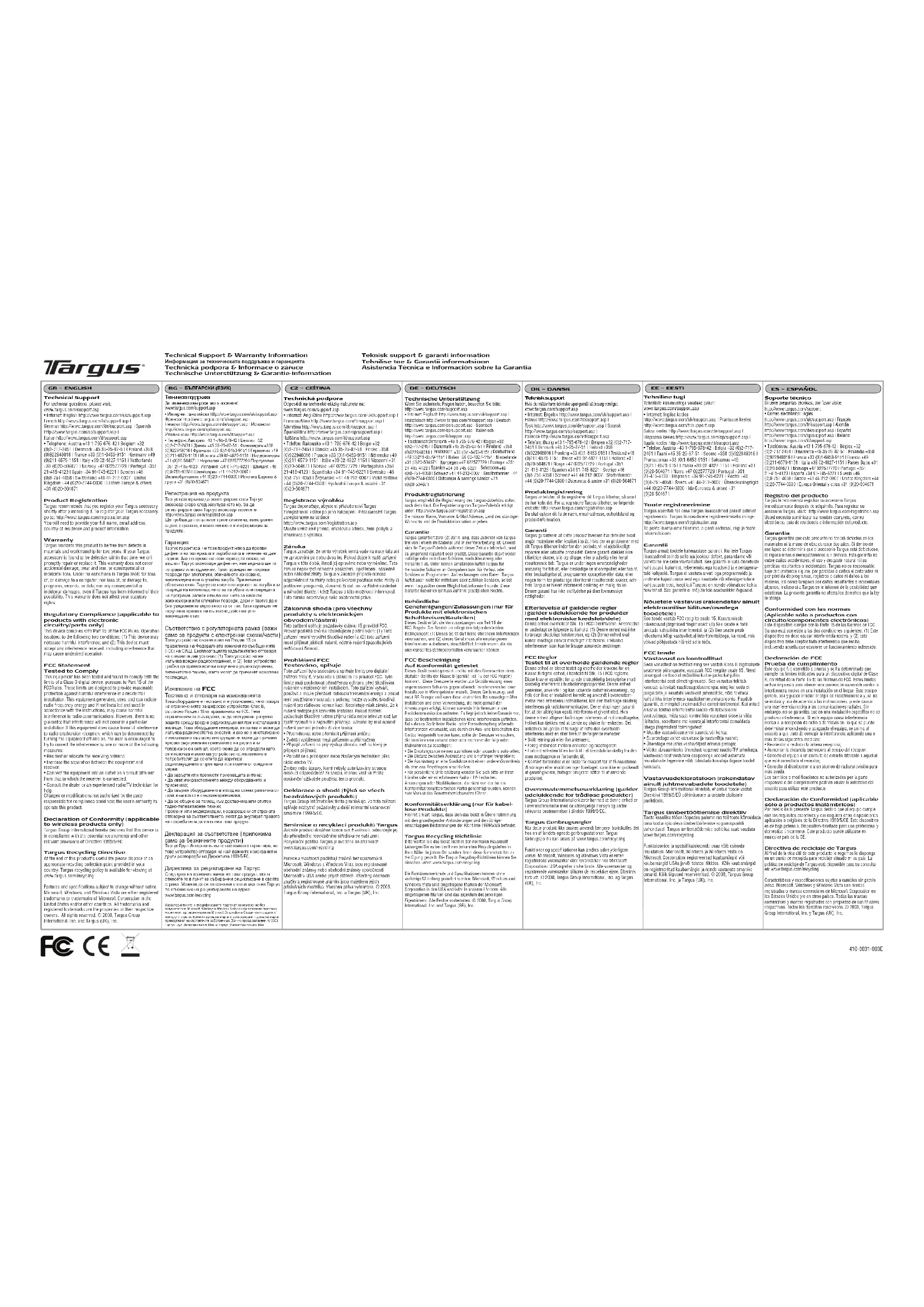 Tehnička podrška i informacije o garanciji Technikai segítség és garanciainformáció Assistenza tecnica e informazioni sulla garanzia FI – SUOMIFR – FRANÇAISGR – ΕΛΛΗΝΙΚΆHR – HRVATSKIHU – MAGYARIT – ITALIANOSupport techniquePour les questions techniques, merci de visiter : http://www.targus.com/support• Internet: Anglais http://www.targus.com/uk/support.asp | Français http://www.targus.com/fr/support.asp | Allemand http://www.targus.com/de/support.asp | Espagnol http://www.targus.com/sp/support.asp | Italien http://www.targus.com/it/support.asp• Téléphone: l'Autriche +43 1-795-676-42 | Belgium +32 (0)2-717-2451 | Danemark +45 35-25-87-51 | Finlande +358 (0)922948016 | France +33 (0)1-6453-9151 | Allemagne +49 (0)211-6579-1151 | Italie +39 02-4827-1151 | Hollandes +31 (0)20-504671 | Norvège +47 022577729 | Le Portugal +351 21-415-4123 | Espagne +34 91-745-6221 | Suède +46 (0)8-751-4058 | Suisse +41 44-212-0007 | Royaume-Uni +44 (0)20-7744-0330 | Europe de l'Est et autres pays +31 (0)20-504671Enregistrement du produitTargus vous conseille vivement d'enregistrer votre accessoire Targus dans les plus brefs délais après son achat. Pour l'enregistrer connectez-vous à : http://www.targus.com/registration.aspVous devrez fournir votre nom et prénoms, adresse email, pays de résidence et information sur le produit.GarantieTargus garantit ce produit contre tout défaut de matériel ou de abrication pour une durée de deux ans. Si votre accessoire Targus s'avère défectueux sous cette garantie, nous veillerons à le remplacer ou à le réparer au plus vite. Cette garantie ne couvre pas les dommages résultant d'accidents, l'usure normale ou les pertes consécutives ou accessoires. En aucun cas, Targus ne pourra être tenu responsable de la perte matérielle ou de l'endommagement d'un ordinateur, ni de la perte de programmes, d'enregistrements ou de données ou de leur endommagement, ni de tout autre dommage indirect ou accidentel, même si Targus a été préalablement informé de cette possibilité. Cette garantie n'a aucun effet sur vos droits statutaires. Respect de la réglementation (pour les appareils contenant uniquement des pièces/circuits électroniques)Cet appareil est conforme à la section 15 des règlements de la FCC (Federal Communication Commission). Son utilisation est soumise aux deux conditions suivantes : 1) Cet appareil ne peut provoquer de brouillage préjudiciable. 2) Cet appareil doit absorber toute interférence réceptionnée, même si cela provoque des effets indésirables sur son fonctionnement.Déclaration de la FCCTesté et conformeCet appareil a été testé et déclaré conforme aux limites des appareils numériques de Classe B, selon la section 15 des règlements de la FCC (Federal Communication Commission). Ces limites sont conçues pour assurer une protection raisonnable contre un brouillage préjudiciable lorsque l'appareil est utilisé dans un milieu résidentiel. L'appareil génère, utilise et peut diffuser de l'énergie sur les fréquences radio et, s'il n'est pas installé et utilisé conformément au mode d'emploi, il peut brouiller les communications radio. Il n'y a aucune garantie qu'un brouillage ne se produira pas dans un milieu particulier. Si cet appareil brouille les communications radio ou télévision, comme cela peut être confirmé en éteignant puis en allumant l'appareil, l'utilisateur peut tenter de corriger toute interférence en essayant une ou plusieurs des méthodes suivantes : • Réorienter l'antenne réceptrice ou la placer à un autre endroit;• Éloigner davantage l'appareil du récepteur;• Brancher l'appareil sur une autre prise de courant ou un circuit électrique différent de celui auquel le récepteur est connecté;• Pour toute aide, consulter le distributeur ou un technicien expérimenté radio/TV.Toute modification non autorisée par les autorités responsables de la conformité peut entraîner la révocation du droit d'utilisation de ce produit.Conformément à la directive (pour les appar-eils sans fil uniquement)Cet appareil se situe au-dessous de la classification Class 1 conformément à la R&TTE Directive (99/5/EC). Cet appareil fonctionne en faible puissance (27 MHz). L'appareil est prévu pour un usage au bureau ou à la maison. Cet accessoire peut être utilisé dans tous les pays européens.Politique de Recyclage TargusLorsque ces produits ne sont plus utilisables, merci de les apporter à un centre de recyclage approprié dans votre pays. La politique de recyclage TARGUS est consultable à l'adresse: www.targus.com/recyclingLes caractéristiques et spécifications peuvent être modifiées sans préavis. Microsoft, Windows et Windows Vista sont des marques déposées ou commerciales de Microsoft Corporation aux États-Unis et/ou dans d'autres pays. Toutes les marques commerciales et déposées sont les propriétés de leurs détenteurs respectifs. Tous droits réservés. © 2008, Targus Group International, Inc. et Targus (RU), Inc. Teknisk støtte & garantiinformasjon Teknisk support & Garanti information Tekninen tuki ja takuutiedot Teknisk support & garanti information Informacje dotyczące wsparcia technicznego i gwarancji Информация по технической поддержке и гарантии Supporto tecnicoIn caso di quesiti tecnici, visitare: http://www.targus.com/support.asp• Internet: Inglese http://www.targus.com/uk/support.asp | Francese http://www.targus.com/fr/support.asp | Tedesco http://www.targus.com/de/support.asp | Spagnolo http://www.targus.com/sp/support.asp | Italian http://www.targus.com/it/support.asp
