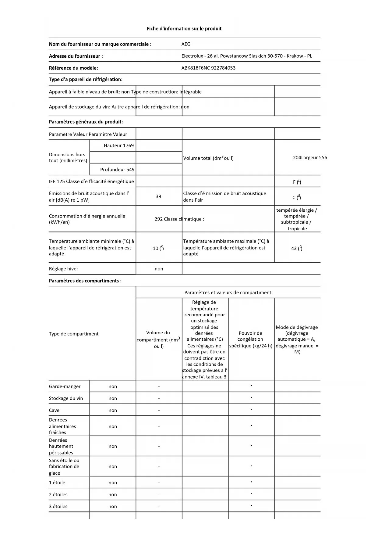 Fiche d'information sur le produit Nom du fournisseur ou marque commerciale : AEG Adresse du fournisseur : Electrolux - 26 al. Powstancow Slaskich 30-570 - Krakow - PL Référence du modèle:
