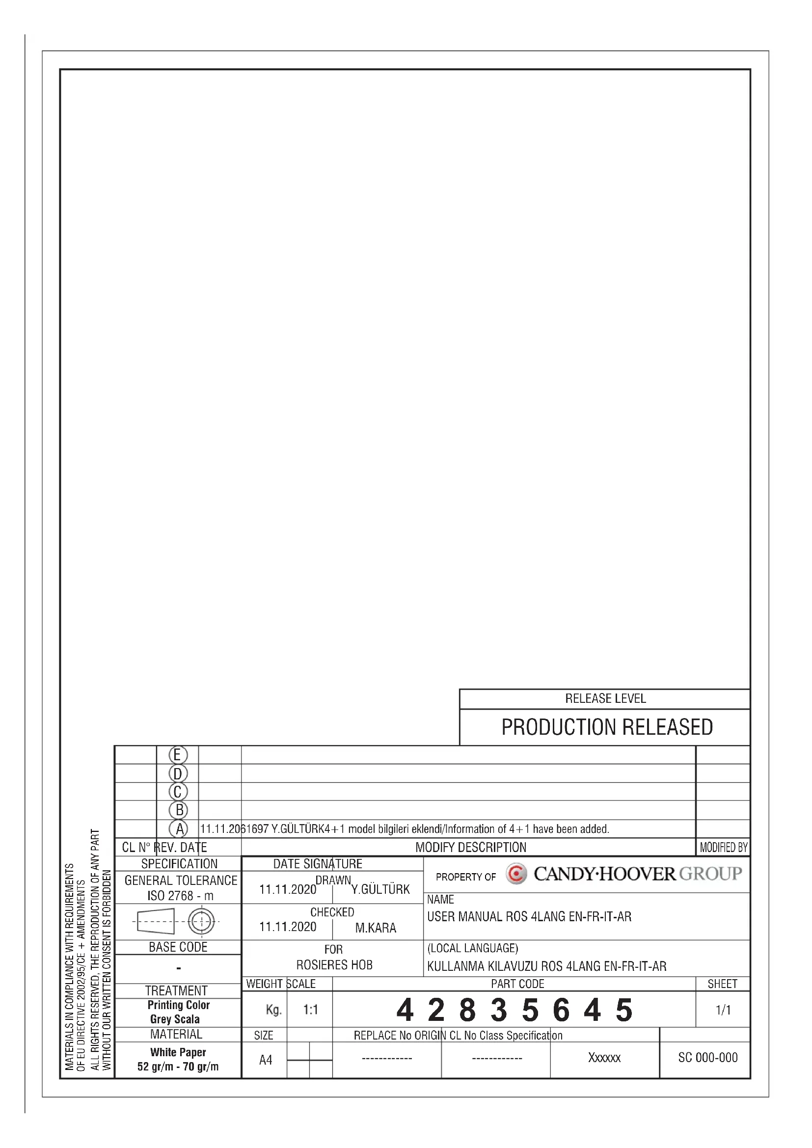 Le constructeur décline toute responsabilité concernant d'éventuelles inexacitudes imputables à des erreurs d'impression ou de transcription contenue dans cette notice. Le constructeur se réserve le droit de modifier les produits en cas de nécessité, même dans l'intérêt de l'utilisation, sans causer de préjudices aux caractéristiques de fonctionnement de sécurité des appareils. 42835645 • A4 • .2020 • Rev_11 A