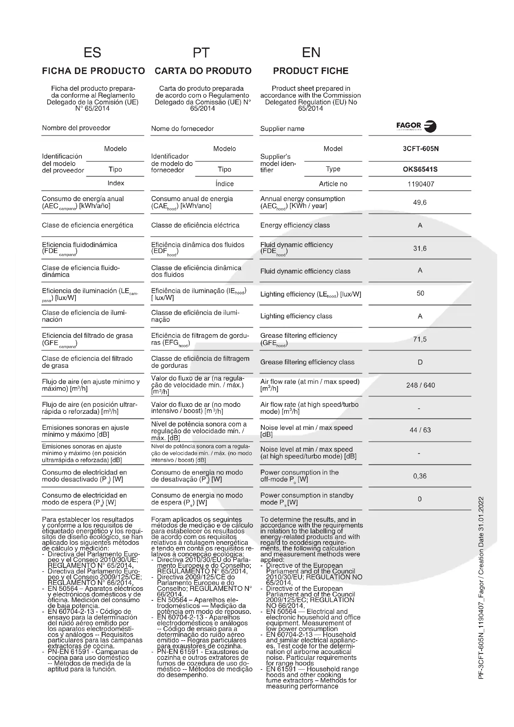 ) [W] Carte du produit préparée conformément au Règlement Délégué (UE) Nº 65/2014 de la Commission Conformément aux exigences quand à l’étiquetage énergétique et par rapport aux exigences concernant les éco-projets les méthodes de calcul et de mesure suivantes ont été appliquées pour établir les résultats :- Directive du Parlement Européen et de la Commission 2010/30/UE ; REGLEMENT Nº 65/2014,- Directive du Parlement Européen et de la Commission 2009/125/CE ; REGLEMENT Nº 66/2014,- EN 50564 – Equipement électrique domestique – mesure de la con-sommation en énergie en état de disposition au travail.- EN 60704-2-13 – Appareils électriques à utilité domestique et similaires -- Procédure de mesure de la puissance acoustique – Exigences particulières pour les hottes.- EN 61591 – Hottes domestiques et autres extracteurs de vapeurs de cuisine – Méthodes de tests des traits fonctionnels. FRESPECIFICAÇÕES TÉCNICAS