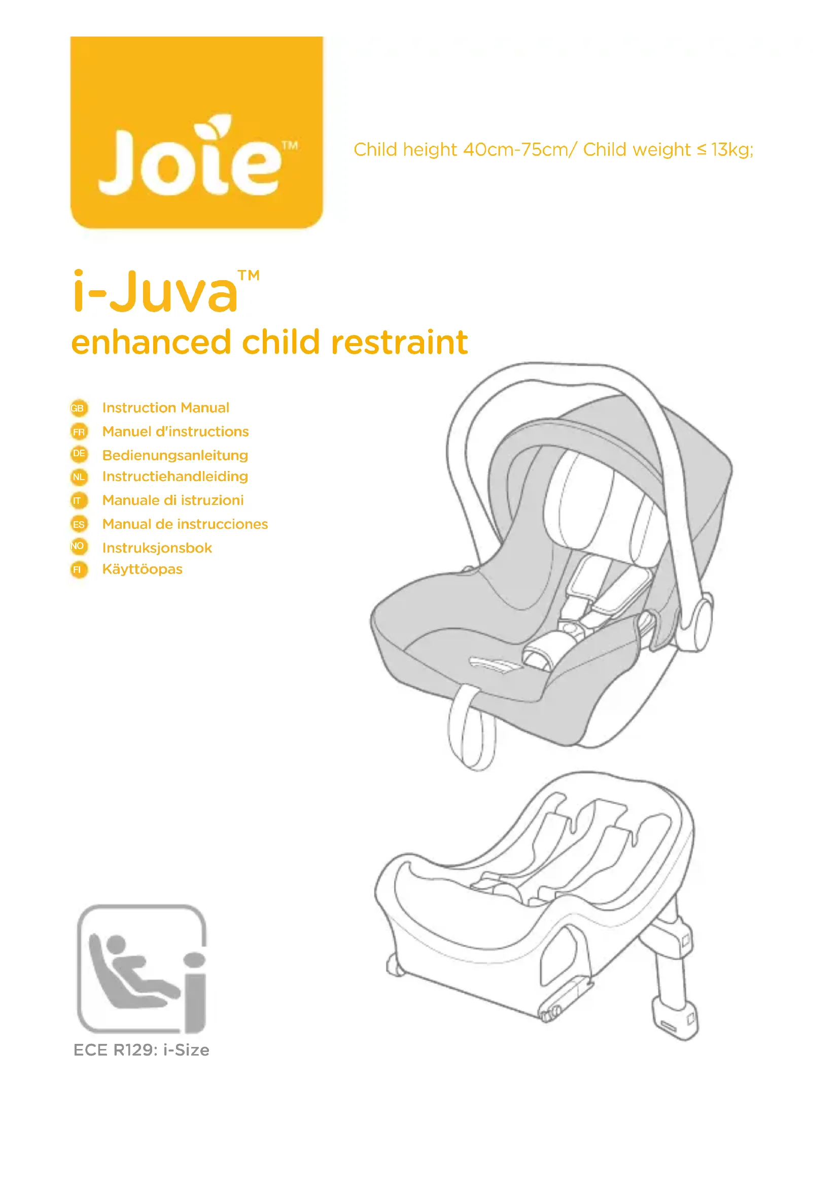 vous souhaite la bienvenue Nous vous félicitons d’avoir rejoint la famille Joie ! Nous sommes très heureux de pouvoir faire partie de votre voyage avec votre petit. En voyageant avec le dispositif de retenue pour enfants amélioré Joie i-Juva™, vous utilisez un dispositif de retenue pour enfants amélioré de haute qualité i-Size, avec une sécurité entièrement certifiée. Veuillez lire ce manuel et suivre chaque étape pour assurer le confort et la meilleure protection possible pour votre enfant.Pour utiliser ce dispositif de retenue pour enfants amélioré Joie avec les connexions i-Size ISOFIX conformément à la réglementation ECE R129, votre enfant doit correspondre aux conditions suivantes.Taille de l'enfant entre 40 cm et 75 cm / Poids de l'enfant ≤ 13 kg (Âge de l'enfant ≤ 12 mois).Pour utiliser cette coque de bébé avec la ceinture du véhicule, votre enfant doit répondre aux conditions suivantes. Taille de l'enfant entre 40 cm et 75 cm / Poids de l'enfant ≤ 13 kg (Âge de l'enfant ≤ 12 mois). Base Ces instructions présentent l'utilisation du module de transport bébé et de la base. Cette base peut aussi être utilisée avec d'autres modules de transport bébé Joie. Veuillez lire toutes les instructions de ce manuel avant d'installer et d'utiliser le produit.! IMPORTANT : À CONSERVER POUR TOUTE CONSULTATION ULTÉRIEURE.À LIRE ATTENTIVEMENT.Veuillez conserver le manuel d'instructions dans le compartiment de stockage en bas de la base, comme sur l'illustration à droite. Veuillez conserver le mode d'emploi dans la partie inférieure des pièces souples.Pour des informations sur la garantie, veuillez visiter notre site Web sur joiebaby.com *i-Base 2 vendu séparément.