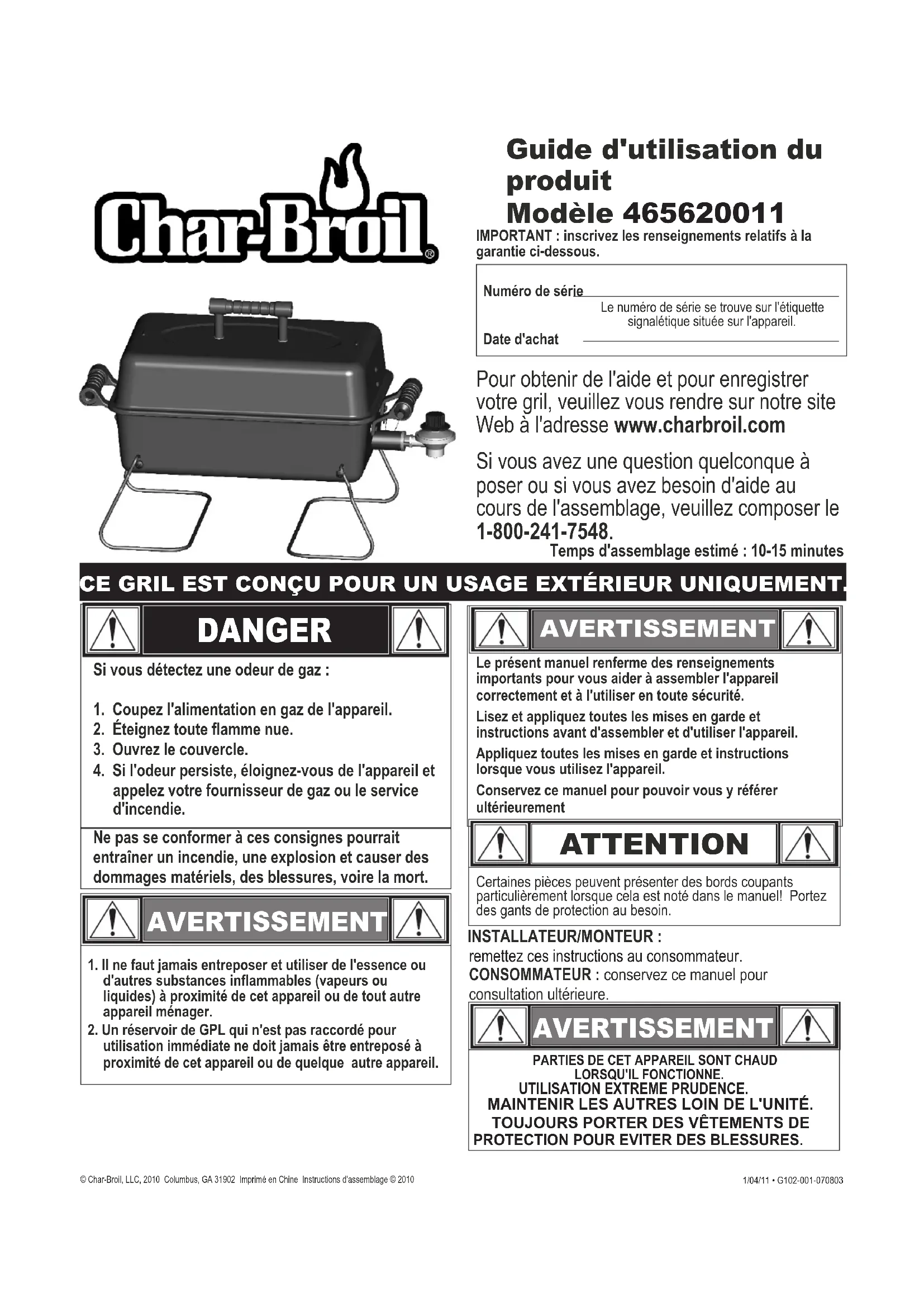 - © Char-Broil, LLC, 2010 Columbus, GA 31902 Imprimé en Chine Instructions d'assemblage © 2010 Guide d'utilisation du produit Modèle 465620011 Numéro de sérieDate d'achat IMPORTANT : inscrivez les renseignements relatifs à la garantie ci-dessous. Le numéro de série se trouve sur l'étiquette signalétique située sur l'appareil. Pour obtenir de l'aide et pour enregistrer votre gril, veuillez vous rendre sur notre site Web à l'adresse www.charbroil.com Temps d'assemblage estimé : 10-15 minutes Si vous avez une question quelconque à poser ou si vous avez besoin d'aide au cours de l'assemblage, veuillez composer le 1-800-241-7548. CE GRIL EST CONÇU POUR UN USAGE EXTÉRIEUR UNIQUEMENT.1. Il ne faut jamais entreposer et utiliser de l'essence ou d'autres substances inflammables (vapeurs ou liquides) à proximité de cet appareil ou de tout autre appareil ménager. 2. Un réservoir de GPL qui n'est pas raccordé pour utilisation immédiate ne doit jamais être entreposé à proximité de cet appareil ou de quelque autre appareil. AVERTISSEMENT DANGER Si vous détectez une odeur de gaz : 1. Coupez l'alimentation en gaz de l'appareil.2. Éteignez toute flamme nue.3. Ouvrez le couvercle.4. Si l'odeur persiste, éloignez-vous de l'appareil et appelez votre fournisseur de gaz ou le service d'incendie. AVERTISSEMENT INSTALLATEUR/MONTEUR : remettez ces instructions au consommateur.CONSOMMATEUR : conservez ce manuel pour consultation ultérieure. Le présent manuel renferme des renseignements importants pour vous aider à assembler l'appareil correctement et à l'utiliser en toute sécurité. Lisez et appliquez toutes les mises en garde et instructions avant d'assembler et d'utiliser l'appareil. Appliquez toutes les mises en garde et instructions lorsque vous utilisez l'appareil.Conservez ce manuel pour pouvoir vous y référer ultérieurement Ne pas se conformer à ces consignes pourrait entraîner un incendie, une explosion et causer des dommages matériels, des blessures, voire la mort. ATTENTION Certaines pièces peuvent présenter des bords coupants particulièrement lorsque cela est noté dans le manuel! Portez des gants de protection au besoin. PARTIES DE CET APPAREIL SONT CHAUDUTILISATION EXTREME PRUDENCE. TOUJOURS PORTER DES VÊTEMENTS DEMAINTENIR LES AUTRES LOIN DE L'UNITÉ. AVERTISSEMENT PROTECTION POUR EVITER DES BLESSURES. LORSQU'IL FONCTIONNE.1/04/11 • G102-001-070803Renseignements relatifs à la garantie p. 1