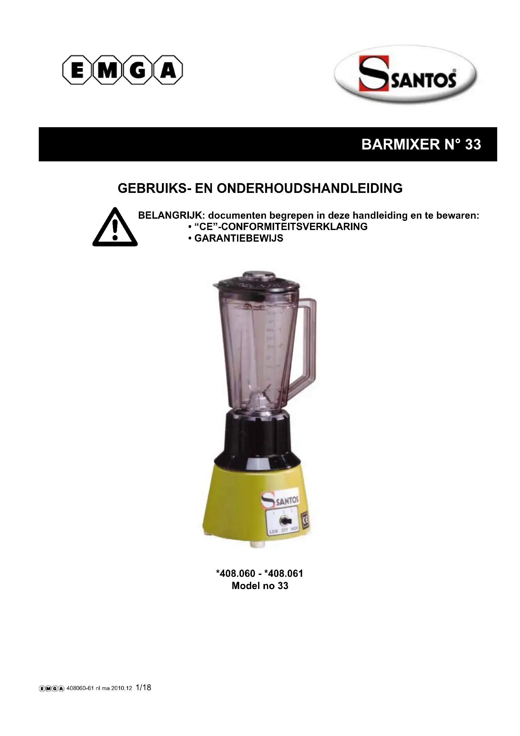 SPECIMEN Pour tous les documents non livrés avec l’appareil. Imprimés, Faxés, Téléchargés Depuis le 01.01.95, tous nos appareils sont conformes CE et revêtus du label CE. Notre garantie est de douze mois à partir de la date de fabrication figurant sur la plaque signalétique. La garantie est strictement limitée au remplacement gratuit de toute pièce d'origine reconnue par nous défectueuse à la suite d'un défaut ou d'un vice de construction et identifiée comme appartenant à l'appareil considéré. Elle ne s'applique pas aux avaries résultant d'une installation ou d'une utilisation non-conforme aux prescriptions accompagnant chaque appareil (manuel d'utilisation) ou dans le cas d'un manque évident d'entretien ou de non observation des règles élémentaires de sécurité électriques. La garantie ne s’applique pas en cas d’usure naturelle. Tout remplacement de pièce sous garantie est effectué après renvoi de la pièce défectueuse en nos ateliers en port payé, accompagnée d'une copie de la Déclaration de conformité sur laquelle figure le numéro de série de l'appareil. Tout appareil est muni d'une plaque signalétique conforme CE et dont un double figure dans la Déclaration de conformité (N° de série, date de fabrication, caractéristiques électriques…). En cas d'avarie grave jugée réparable uniquement dans nos ateliers, et après accord préalable de nos services, tout appareil sous garantie est expédié par le Distributeur en port payé. En cas de réparation ou reconditionnement d'appareil hors garantie, le transport aller- retour est à la charge du Distributeur. Les pièces et main-d’oeuvre sont facturées aux tarifs en vigueur (tarif pièces détachées – tarif horaire – main-d’oeuvre). Il peut être fourni un devis préalable. Les moulins à café non munis de meules originales SANTOS ne sont pas pris sous garantie. Les conditions de garantie, réparation, reconditionnement, des moulins à café espresso font l’objet d’une notice spécifique. Notre garantie ne s’étend pas au paiement de pénalités, à la réparation des préjudices directs ou indirects et notamment à tout manque à gagner résultant de la non-conformité ou défectuosité des produits, la responsabilité globale de SANTOS étant limitée au prix de vente du produit livré et à l’éventuelle réparation des produits défectueux. En cas de révélation d'une défectuosité pendant la période de garantie, le Distributeur doit, sauf accord contraire écrit de SANTOS, indiquer à son client, de cesser toute utilisation du produit défectueux. Une telle utilisation dégagerait SANTOS de toute responsabilité. GARANTIE 408060-61 fr ma 2010.12 18/18BARMIXER NR. 33