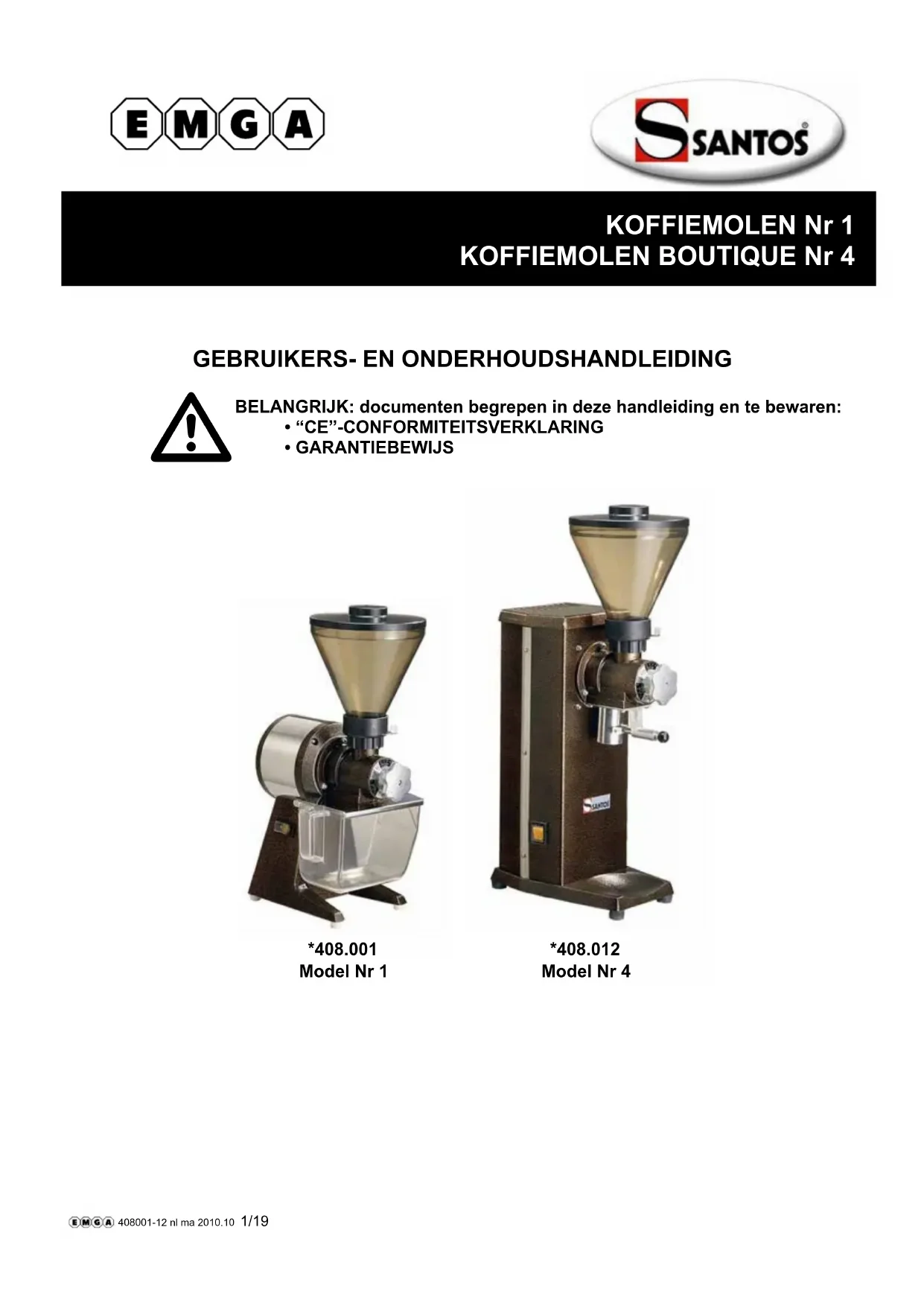 LE FABRICANT : SANTOS SAS - 140-150, Av. Roger SALENGRO 69120 VAULX-EN-VELIN (LYON) FRANCE Déclare que l’appareil destiné à être mis sur le marché professionnel, désigné ci-après : Désignation : Moulin à café boutique Numéro de type : 01, 01PS, 01P, 04 est conforme : aux dispositions réglementaires définies par l’annexe 1 de la directive européenne "machines" n°2006/42/CE, et aux législations nationales la transposant. aux dispositions réglementaires des directives et règlements européens suivants : o N° 2006/95/CE (Directive basse tension) o N° 2004/108/CE (Directive CEM) o N° 2002/95/CE (Directive RoHS) o N° 2002/96/CE (Directive DEEE) o N° 1935/2004/CE (Règlement) concernant les matériaux et objets destinés à entrer en contact avec des denrées alimentaires Normes européennes harmonisées utilisées pour donner présomption de conformités aux exigences essentielles des directives citées précédemment : NF EN ISO 12100 -1 et 2 :2004 : Sécurités des Machines - Principes généraux de conception NF EN 60204-1 : 2006 : Sécurités des machines - Équipement électrique des machines - Règles générales NF EN 1672-2 : 2005, Machines pour les produits alimentaires - Notions fondamentales - Prescriptions relatives à l’hygiène. NF EN 60335-1 : 2003 : Sécurité des appareils électrodomestiques et analogues NF EN 60335-2-64 :2004 : Règles particulières pour les machines de cuisine électriques à usage collectif Fait à VAULX-EN-VELIN le : 01/10/2010 Titre du signataire : PRÉSIDENT DIRECTEUR GÉNÉRAL Nom du signataire : Aurélien FOUQUET Signature : 408001-12 fr ma 2010.10 3/20REGLES DE SECURITES Lors de l’utilisation, l’entretien ou la mise au rebut de l’appareil, toujours veiller à bien respecter les précautions élémentaires suivantes. Lire la totalité de la notice explicative Note : Pour faciliter la compréhension des paragraphes suivants, veuillez vous référer aux schémas situés en fin de manuel CONTRE INDICATIONS :