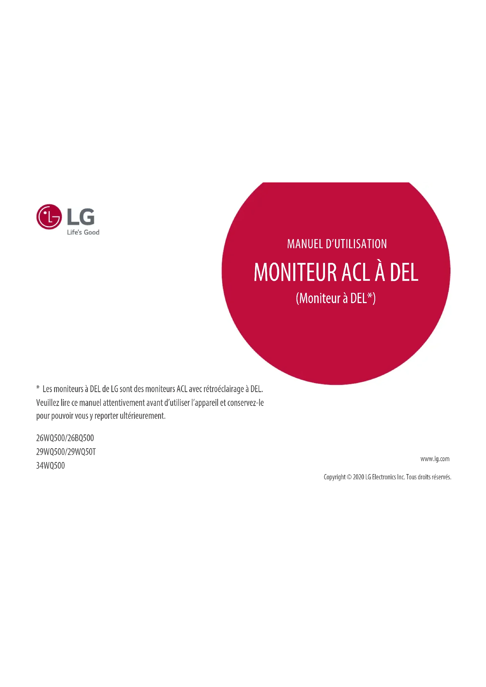 - Les moniteurs à DEL de LG sont des moniteurs ACL avec rétroéclairage à DEL. Veuillez lire ce manuel attentivement avant d’utiliser l’appareil et conservez-le pour pouvoir vous y reporter ultérieurement. 26WQ500/26BQ500 29WQ500/29WQ50T 34WQ500