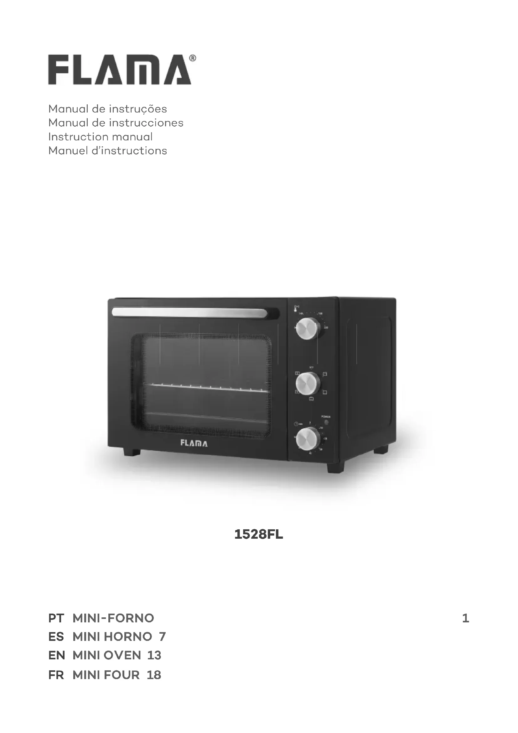 Before cleaning, unplug the appliance and wait unl it cools down. Aer each use and before carrying out any cleaning operaons, always unplug the appliance and allow the appliance to cool down completely. Let the oven cool down with the oven door ajar. To do this, simply pull the door slightly to the intermediate opening posion. When completely cool: Remove the griddle, tray and waste tray. Clean the inside of the oven with a so, damp cloth and then with a so, dry cloth. Do not use a brush with strong bristles, as it may scratch the inner surface of the oven. Wash the grid, tray and waste tray by hand in hot water with a so sponge and a non- abrasive detergent. Wipe with a so, dry cloth to remove excess water. Important – you should never wash the tray or waste tray in the dishwasher. Detergents can cause changes in color or shine, without, however, changing their eciency. Wipe the outside of the appliance with a damp cloth and then with a so, dry cloth. Do not immerse the appliance in water or put it under the tap. Do not use toxic or abrasive cleaning products such as gasoline, polishing powder or thinner.18 www.ama.pt MINI FOUR Lire aenvement ces instrucons avant la première ulisaon et les conserver pour une référence ultérieure. Une ulisaon non conforme aux instrucons dégagerait FLAMA de toute responsabilité. Vérier que la tension d’alimentaon de l’installaon correspond à celle indiquée sur la plaque signaléque de l’appareil. Cet appareil doit être raccordé à une prise de terre. Vérier que le disjoncteur de protecon du circuit sur lequel vous allez brancher l’appareil est d’un minimum de 10A. Ne pas mouiller le câble ou manipuler l’appareil avec des mains mouillées. Éviter d’uliser des prises de type « T » ou des rallonges. L’appareil ne doit être ulisé que pour cuisiner les aliments. L’ulisaon à d’autres ns peut causer des dommages irréparables. Aenon : les températures des surfaces accessibles peuvent être élevées durant le fonconnement de l’appareil. Ne pas toucher ces pièces lors de l’ouverture et la fermeture de la porte. Comme pour tout appareil, il convient de surveiller les enfants lorsqu’ils l’ulisent. Cet appareil peut être ulisé par des enfants de 8 ans ou plus et par des personnes dont les capacités physiques, sensorielles ou mentales sont réduites, ou dénuées d’expérience ou de connaissance si elles sont surveillées ou si elles ont pu bénécier d’instrucons sur son ulisaon en toute sécurité, et sont conscientes des risques encourus. Les enfants ne peuvent uliser le four sans la présence d’un adulte à proximité. Les enfants ne peuvent jouer avec l’appareil. Le neoyage et l’entreen de l’appareil ne doivent pas être19 Français eectués par des enfants, sauf s’ils ont plus de 8 ans et s’ils sont surveillés. Tenir l’appareil et son câble d’alimentaon hors de portée des enfants de moins de 8 ans. Ne pas rerer la che de la prise en exerçant une tracon sur le câble d’alimentaon. Pour débrancher l’appareil, rer sur la che et non sur le câble d’alimentaon. Éteindre l’appareil en rerant la che de la prise de courant avant chaque neoyage ou entreen. Ne pas uliser l’appareil s’il ne fonconne pas correctement ou s’il est endommagé de quelque façon que ce soit. Toute opéraon autre que le neoyage doit être eectuée par un service d’assistance technique agréé FLAMA. Si le câble d’alimentaon est endommagé, demander au service d’assistance technique agréé FLAMA de le remplacer an d’éviter tout danger. L’appareil n’est pas desné à être mis en marche au moyen d’une minuterie externe ou un système de commande à distance séparé. Ce produit est conforme aux direcves concernant la compabilité électromagnéque et la basse tension. Ce manuel d’instrucons est également disponible en format PDF sur www.ama.pt.20 www.ama.pt DESCRIPTION