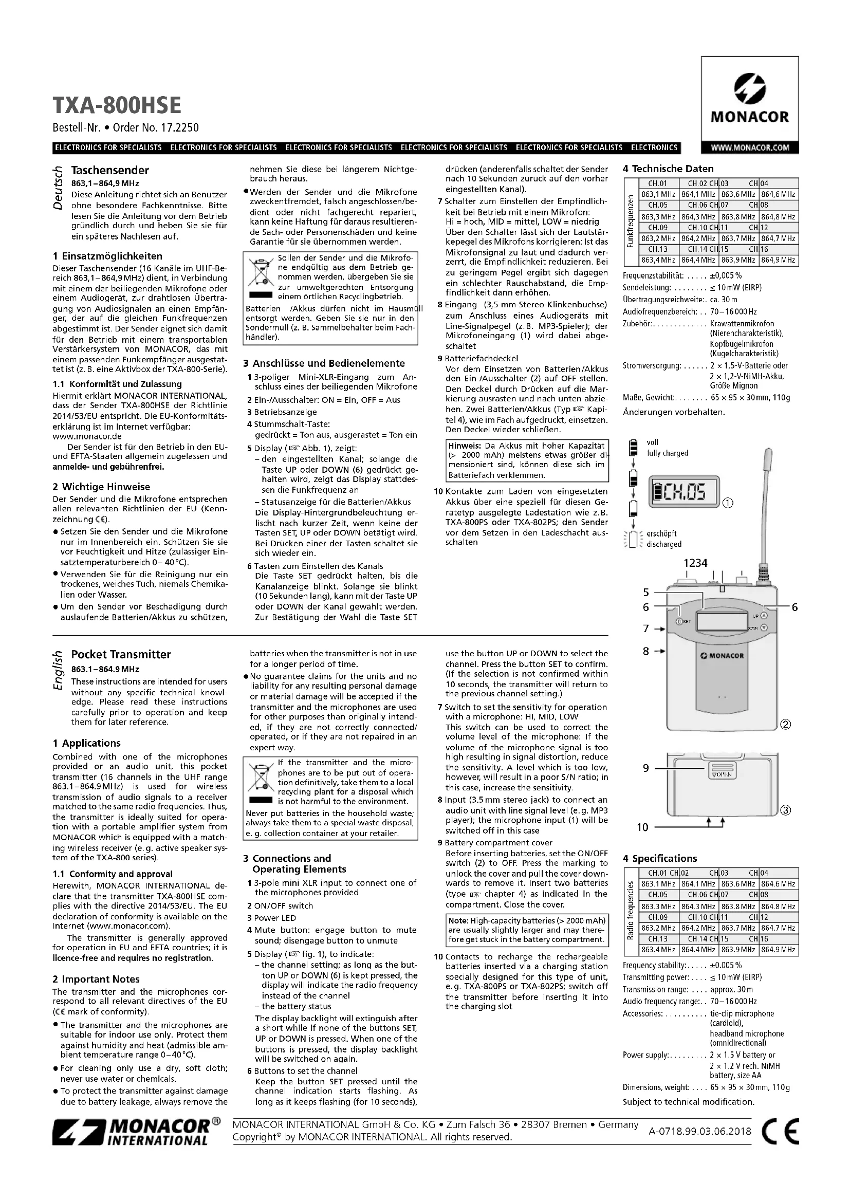 Par la présente, MONACOR INTERNA TIO NAL déclare que l’émetteur TXA-800HSE se trouve en conformité avec la directive 2014 / 53 / UE. La déclaration de conformité UE est dispo- nible sur Internet (www.monacor.com). L’émetteur est autorisé pour un fonction- nement dans les pays de l’Union européenne et de l’A.E.L.E. sans déclaration ni taxe. 2 Conseils importants L’émetteur et les microphones répondent à toutes les directives nécessaires de l’Union européenne (symbole