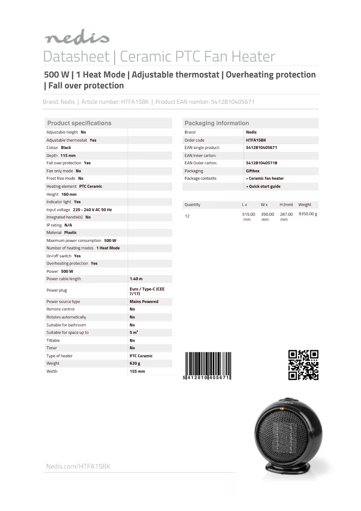 HTFA15BK - Chauffage NEDIS - Notice d'utilisation et mode d'emploi gratuit
