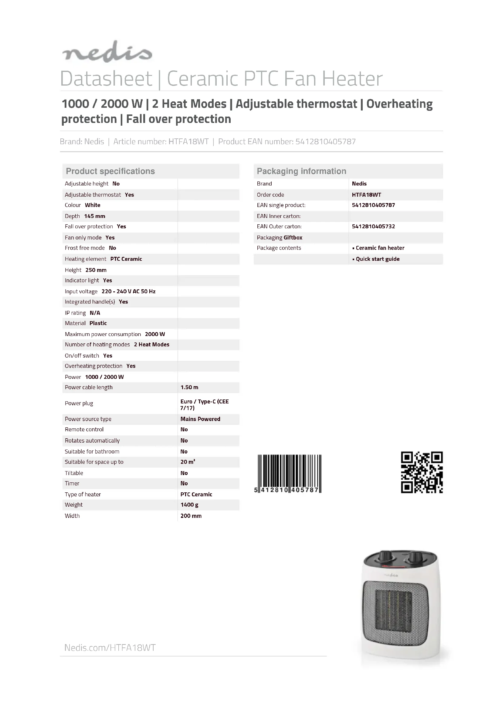 HTFA18WT - Chauffage NEDIS - Notice d'utilisation et mode d'emploi gratuit