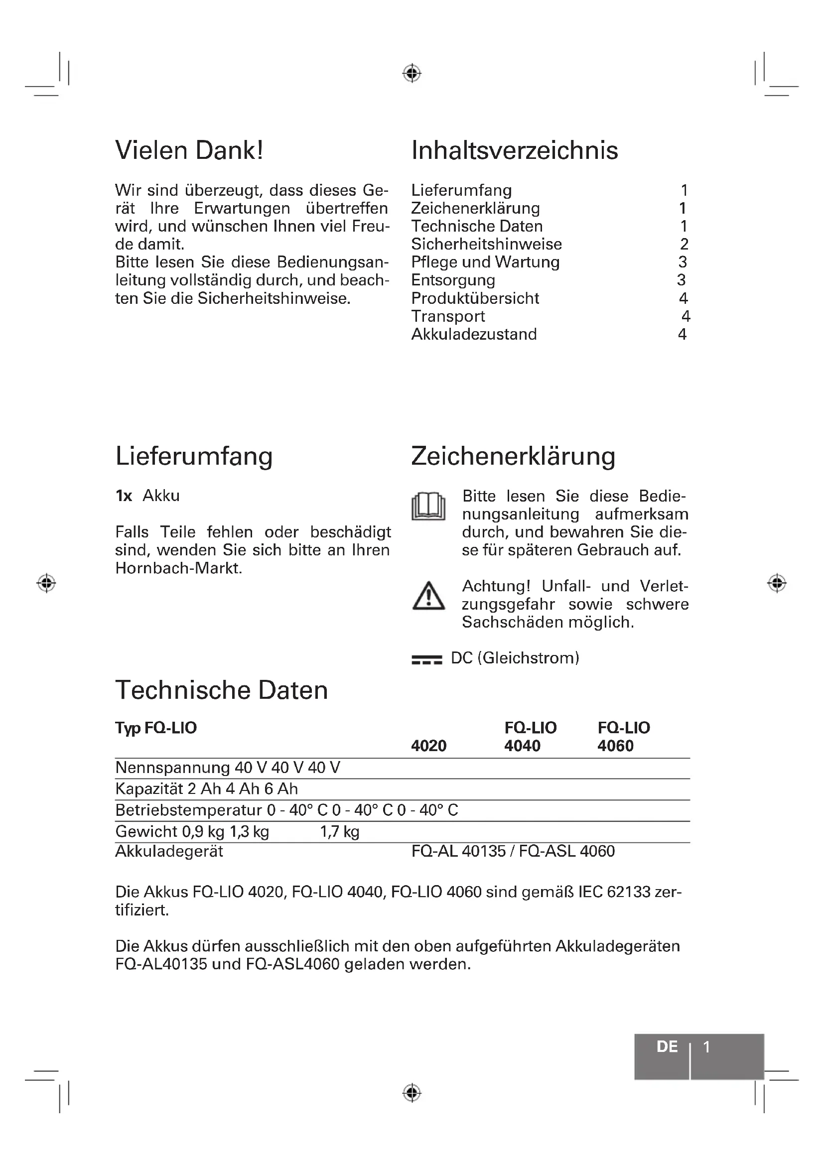 Merci! Nous sommes convaincus que cet équipement dépassera vos attentes et vous souhaitons beaucoup de plai- sir à l'utiliser. Veuillez lire entièrement le présent manuel et observer les consignes de sécurité. Les batteries FQ-LIO4020, FQ-LIO4040, FQ-LIO4060 sont certifiées conformes à la norme IEC62133. Les batteries doivent exclusivement être chargés avec les chargeurs réperto- riés ci-dessus FQ-AL40135 et FQ-ASL4060. Fournitures 1x Batterie Si des pièces sont manquantes ou endommagées, contactez votre ma- gasin Hornbach. Symboles Lisez attentivement le présent manuel de l'utilisateur et conservez-le pour vous y re- porter ultérieurement. Avertissement d'accidents et de blessures corporels ainsi que de dommages matériels importants. CC (courant continu) Caractéristiques techniques Table des matières Fournitures 5 Symboles 5 Caractéristiques techniques 5 Consignes de sécurité 6 Entretien & Maintenance 7 Élimination 7 Vue d'ensemble du produit 8 Transport 8 État de charge de la batterie 8 Type FQ-LIO