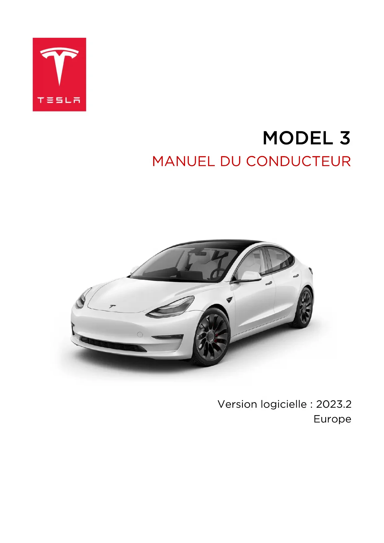 Version logicielle : 2023.2 EuropeMANUEL DU CONDUCTEUR Pour obtenir les informations les plus précises et à jour concernant spécifiquement votre véhicule, consultez le manuel du conducteur sur l'écran tactile de votre véhicule en appuyant sur Contrôles > Entretien > Manuel du conducteur. Les informations disponibles sont spécifiques à votre véhicule en fonction des fonctionnalités que vous avez achetées, de la configuration du véhicule, du marché et de la version du logiciel. À l'inverse, les informations du propriétaire fournies par Tesla par tout autre moyen sont mises à jour ponctuellement et sont susceptibles de ne pas concerner précisément votre véhicule.