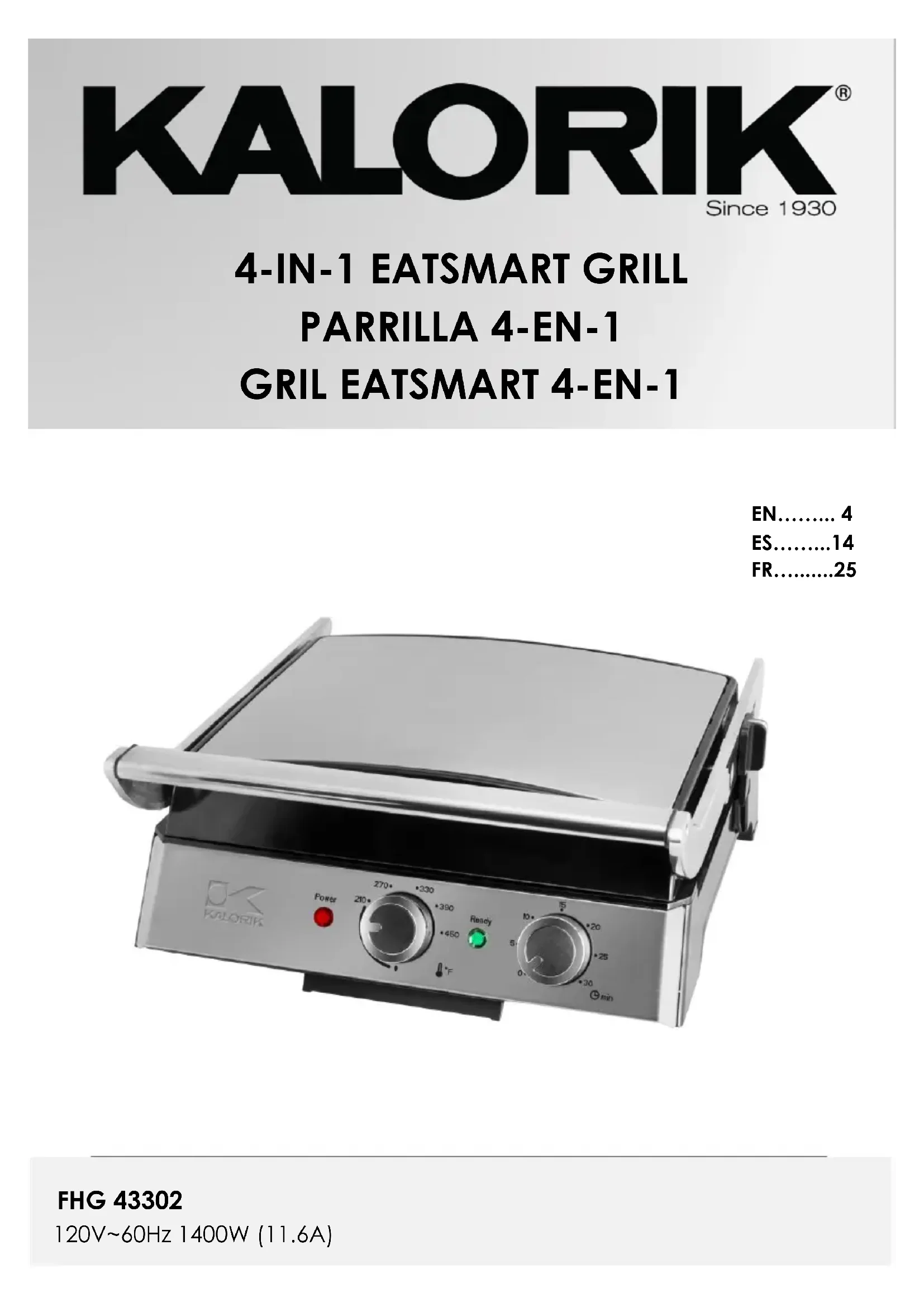Retrouvez gratuitement la notice de l'appareil FHG 43302 SS KALORIK au format PDF.