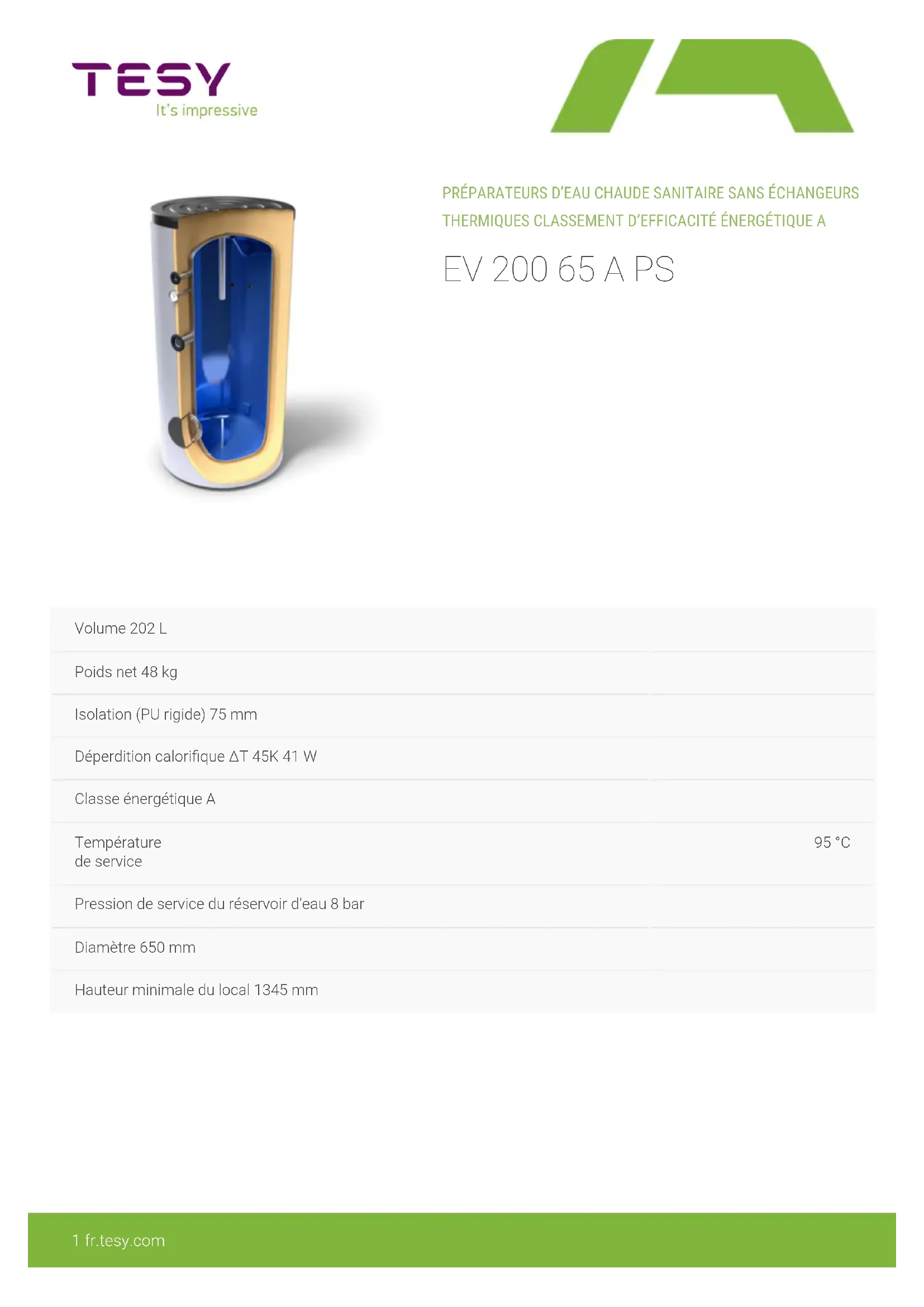 Volume 202 L Poids net 48 kg Isolation (PU rigide) 75 mm Déperdition calorifique ΔT 45K 41 W Classe énergétique A Température de service 95 °C Pression de service du réservoir d’eau 8 bar Diamètre 650 mm Hauteur minimale du local 1345 mm PRÉPARATEURS D’EAU CHAUDE SANITAIRE SANS ÉCHANGEURS THERMIQUES CLASSEMENT D’EFFICACITÉ ÉNERGÉTIQUE A EV 200 65 A PS 1 fr.tesy.com
