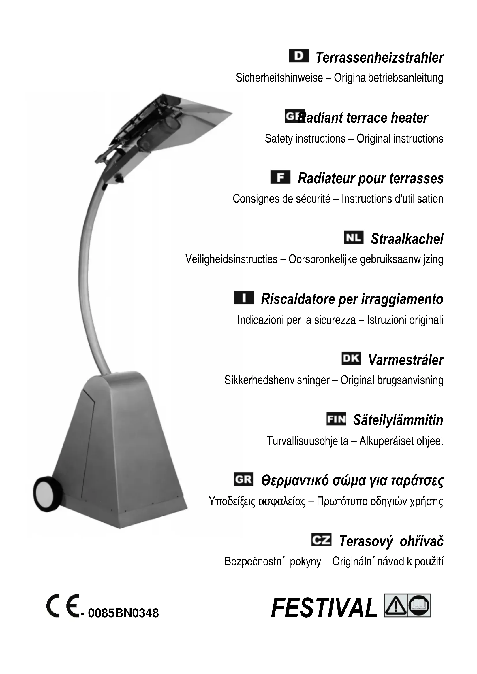 Conformément à la directive 2009/142/EG, nous, la ATIKA GmbH Schinkelstraße 97, 59227 Ahlen, Germany déclarons sous notre propre responsabilité que le produit Radiateur pour terrasses FESTIVAL auquel cette déclaration se rapporte correspond aux exigences de sécurité et de santé fondamentales en vigueur de la directive 2009/142/CE Pour le respect des exigences de sécurité et de santé mentionnées dans les directives de la CE, les normes et spécifications techniques suivantes ont été prises en considération: EN 14543:2007-09 Conservation de la documentation technique : ATIKA GmbH – bureau technique – Schinkelstr. 97 – 59227 Ahlen – Allemagne
